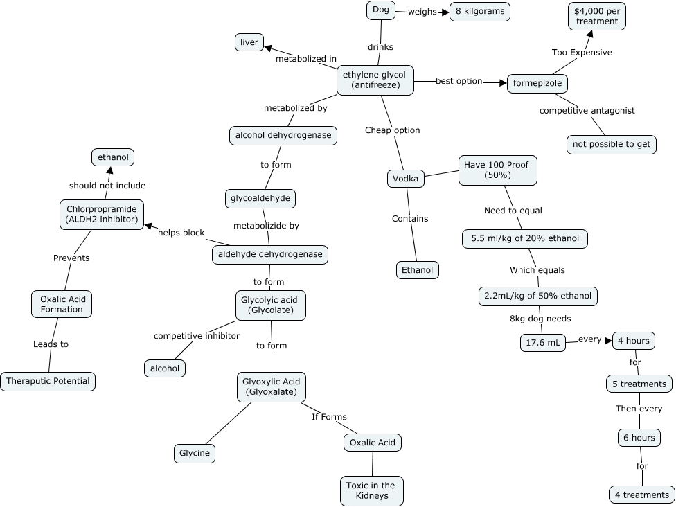 This Concept Map, created with IHMC CmapTools, has information related to: group 5 cmap, Dog weighs 8 kilgorams, Glyoxylic Acid (Glyoxalate) If Forms Oxalic Acid, glycoaldehyde metabolizide by aldehyde dehydrogenase, Glycolyic acid (Glycolate) to form Glyoxylic Acid (Glyoxalate), aldehyde dehydrogenase to form Glycolyic acid (Glycolate), Chlorpropramide (ALDH2 inhibitor) Prevents Oxalic Acid Formation, formepizole Too Expensive $4,000 per treatment, alcohol dehydrogenase to form glycoaldehyde, Vodka ???? Have 100 Proof (50%), ethylene glycol (antifreeze) Cheap option Vodka, Have 100 Proof (50%) Need to equal 5.5 ml/kg of 20% ethanol, Glycolyic acid (Glycolate) competitive inhibitor alcohol, ethylene glycol (antifreeze) best option formepizole, ethylene glycol (antifreeze) metabolized by alcohol dehydrogenase, Dog drinks ethylene glycol (antifreeze), formepizole competitive antagonist not possible to get, Oxalic Acid Formation Leads to Theraputic Potential, ethylene glycol (antifreeze) metabolized in liver, 5.5 ml/kg of 20% ethanol Which equals 2.2mL/kg of 50% ethanol, aldehyde dehydrogenase helps block Chlorpropramide (ALDH2 inhibitor)