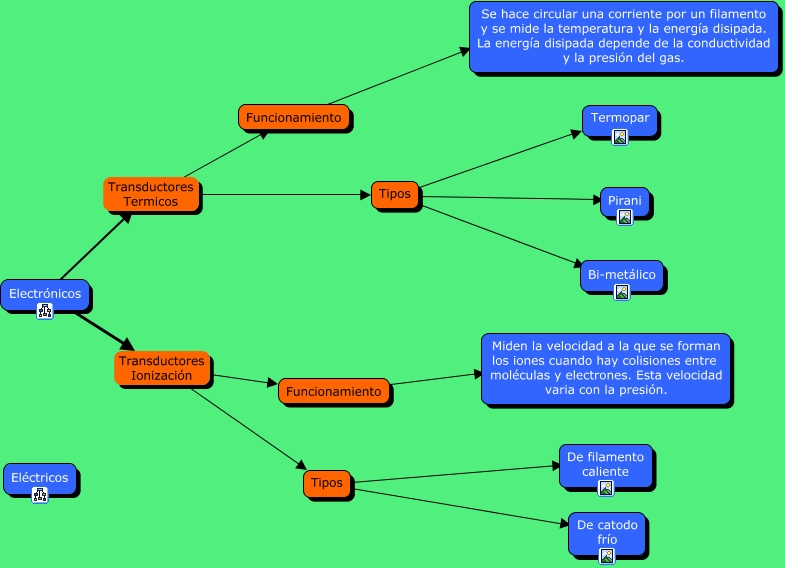 Este Cmap, tiene información relacionada con: Electronicos, Tipos ???? Pirani, Tipos ???? Termopar, Electrónicos Transductores Termicos Funcionamiento, Tipos ???? De filamento caliente, Funcionamiento ???? Se hace circular una corriente por un filamento y se mide la temperatura y la energía disipada. La energía disipada depende de la conductividad y la presión del gas., Tipos ???? Bi-metálico, Funcionamiento ???? Miden la velocidad a la que se forman los iones cuando hay colisiones entre moléculas y electrones. Esta velocidad varia con la presión., Tipos ???? De catodo frío, Electrónicos Transductores Termicos Tipos, Electrónicos Transductores Ionización Funcionamiento, Electrónicos Transductores Ionización Tipos