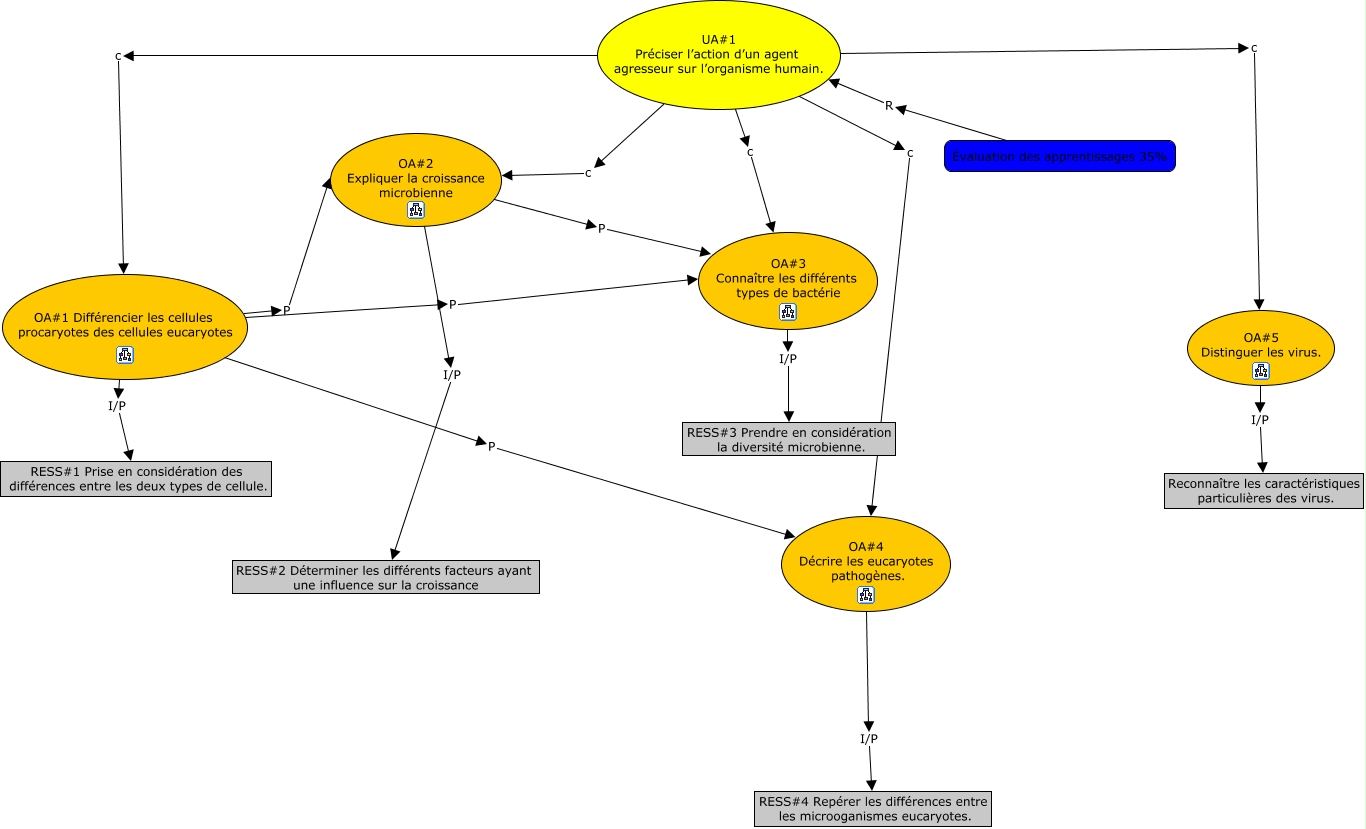 Cette carte de concepts créée avec IHMC CmapTools traite de: UA.1.cmap, UA#1 Préciser l’action d’un agent agresseur sur l’organisme humain. c OA#2 Expliquer la croissance microbienne, OA#1 Différencier les cellules procaryotes des cellules eucaryotes P OA#3 Connaître les différents types de bactérie, UA#1 Préciser l’action d’un agent agresseur sur l’organisme humain. c OA#1 Différencier les cellules procaryotes des cellules eucaryotes, UA#1 Préciser l’action d’un agent agresseur sur l’organisme humain. c OA#4 Décrire les eucaryotes pathogènes., OA#4 Décrire les eucaryotes pathogènes. I/P RESS#4 Repérer les différences entre les microoganismes eucaryotes., OA#5 Distinguer les virus. I/P Reconnaître les caractéristiques particulières des virus., OA#1 Différencier les cellules procaryotes des cellules eucaryotes P OA#2 Expliquer la croissance microbienne, OA#2 Expliquer la croissance microbienne P OA#3 Connaître les différents types de bactérie, OA#2 Expliquer la croissance microbienne I/P RESS#2 Déterminer les différents facteurs ayant une influence sur la croissance, UA#1 Préciser l’action d’un agent agresseur sur l’organisme humain. c OA#3 Connaître les différents types de bactérie, Évaluation des apprentissages 35% R UA#1 Préciser l’action d’un agent agresseur sur l’organisme humain., UA#1 Préciser l’action d’un agent agresseur sur l’organisme humain. c OA#5 Distinguer les virus., OA#3 Connaître les différents types de bactérie I/P RESS#3 Prendre en considération la diversité microbienne., OA#1 Différencier les cellules procaryotes des cellules eucaryotes P OA#4 Décrire les eucaryotes pathogènes., OA#1 Différencier les cellules procaryotes des cellules eucaryotes I/P RESS#1 Prise en considération des différences entre les deux types de cellule.