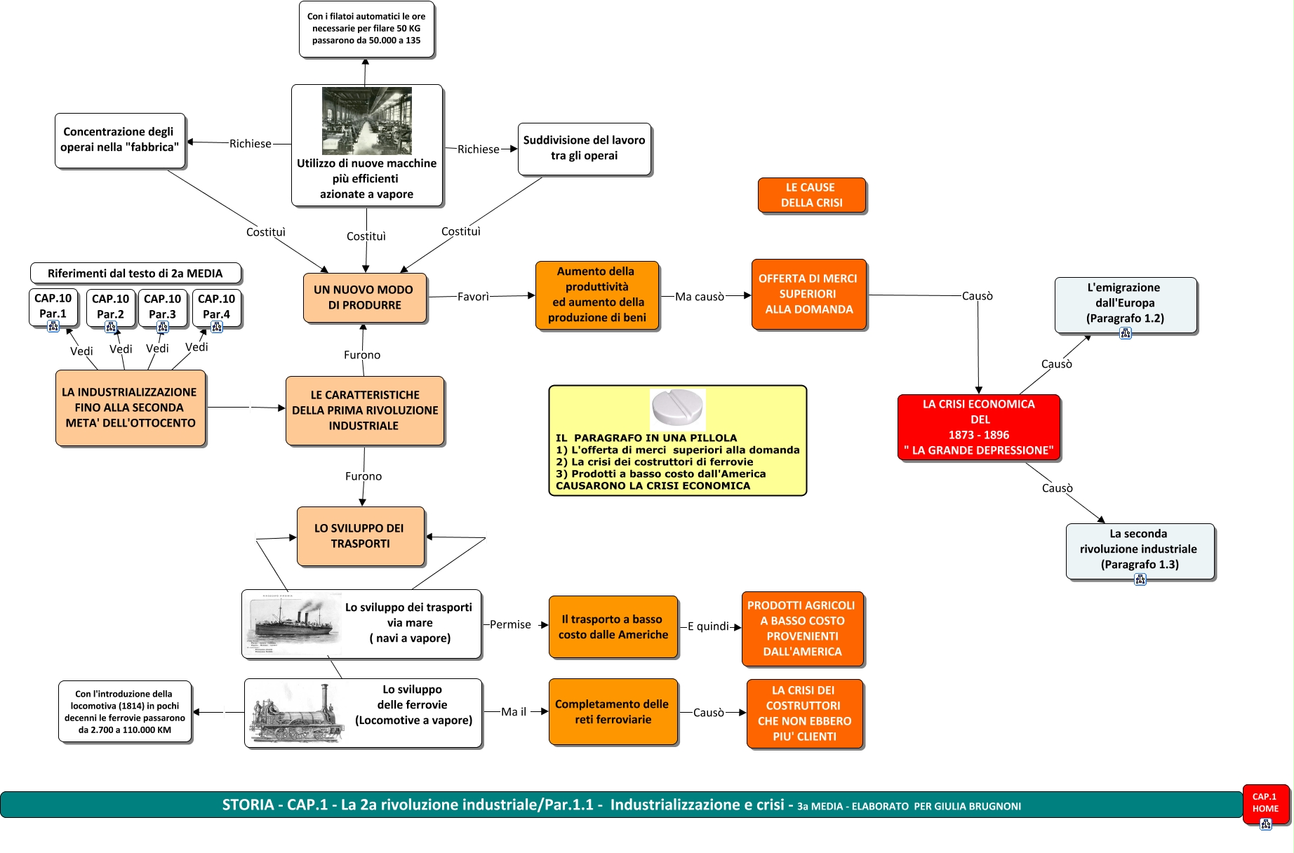 Questa Cmap, creata con IHMC CmapTools, contiene informazioni relative a: Storia - Par.1.1 - Industrializzazione e crisi - GB 3a media, Utilizzo di nuove macchine più efficienti azionate a vapore Richiese Suddivisione del lavoro tra gli operai, Utilizzo di nuove macchine più efficienti azionate a vapore Con i filatoi automatici le ore necessarie per filare 50 KG passarono da 50.000 a 135, Utilizzo di nuove macchine più efficienti azionate a vapore Costituì UN NUOVO MODO DI PRODURRE, Concentrazione degli operai nella "fabbrica" Costituì UN NUOVO MODO DI PRODURRE, LA INDUSTRIALIZZAZIONE FINO ALLA SECONDA META' DELL'OTTOCENTO LE CARATTERISTICHE DELLA PRIMA RIVOLUZIONE INDUSTRIALE, Lo sviluppo delle ferrovie (Locomotive a vapore) Ma il Completamento delle reti ferroviarie, Lo sviluppo delle ferrovie (Locomotive a vapore) LO SVILUPPO DEI TRASPORTI, UN NUOVO MODO DI PRODURRE Favorì Aumento della produttività ed aumento della produzione di beni, LA INDUSTRIALIZZAZIONE FINO ALLA SECONDA META' DELL'OTTOCENTO Vedi CAP.10 Par.3, LA INDUSTRIALIZZAZIONE FINO ALLA SECONDA META' DELL'OTTOCENTO Vedi CAP.10 Par.1, Aumento della produttività ed aumento della produzione di beni Ma causò OFFERTA DI MERCI SUPERIORI ALLA DOMANDA, LA INDUSTRIALIZZAZIONE FINO ALLA SECONDA META' DELL'OTTOCENTO Vedi CAP.10 Par.2, Lo sviluppo dei trasporti via mare ( navi a vapore) LO SVILUPPO DEI TRASPORTI, Lo sviluppo delle ferrovie (Locomotive a vapore) Con l'introduzione della locomotiva (1814) in pochi decenni le ferrovie passarono da 2.700 a 110.000 KM, Completamento delle reti ferroviarie Causò LA CRISI DEI COSTRUTTORI CHE NON EBBERO PIU' CLIENTI, LA CRISI ECONOMICA DEL 1873 - 1896 " LA GRANDE DEPRESSIONE" Causò L'emigrazione dall'Europa (Paragrafo 1.2), LA CRISI ECONOMICA DEL 1873 - 1896 " LA GRANDE DEPRESSIONE" Causò La seconda rivoluzione industriale (Paragrafo 1.3), OFFERTA DI MERCI SUPERIORI ALLA DOMANDA Causò LA CRISI ECONOMICA DEL 1873 - 1896 " LA GRANDE DEPRESSIONE", Lo sviluppo dei trasporti via mare ( navi a vapore) Permise Il trasporto a basso costo dalle Americhe, Il trasporto a basso costo dalle Americhe E quindi PRODOTTI AGRICOLI A BASSO COSTO PROVENIENTI DALL'AMERICA