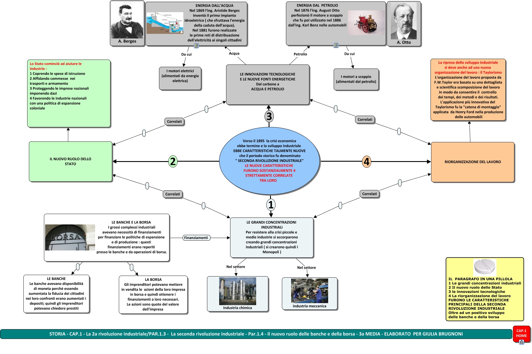 Questa Cmap, creata con IHMC CmapTools, contiene informazioni relative a: Storia - Par.1.3 - La seconda rivoluzione industriale - Par.1.4 - Le banche e la borsa - GB 3a media, RIORGANIZZAZIONE DEL LAVORO ???? La ripresa dello sviluppo industriale si deve anche ad una nuova organizzazione del lavoro : il Taylorismo L'organizzazione del lavoro proposta da F.W.Taylor era basata su una dettagliata e scientifica scomposizione del lavoro in modo da consentire il controllo dei tempi, dei metodi e dei risultati. L'applicazione più innovativa del Taylorismo fu la "catena di montaggio" applicata da Henry Ford nella produzione delle automobili, Correlati LE INNOVAZIONI TECNOLOGICHE E LE NUOVE FONTI ENERGETICHE Dal carbone a ACQUA E PETROLIO, Verso il 1895 la crisi economica ebbe termine e lo sviluppo industriale EBBE CARATTERISTICHE TALMENTE NUOVE che il periodo storico fu denominato " SECONDA RIVOLUZIONE INDUSTRIALE" LE NUOVE CARATTERISTICHE FURONO SOSTANZIALMENTE 4 STRETTAMENTE CORRELATE TRA LORO 2 IL NUOVO RUOLO DELLO STATO, Correlati RIORGANIZZAZIONE DEL LAVORO, IL NUOVO RUOLO DELLO STATO ???? Lo Stato cominciò ad aiutare le industrie : 1 Coprendo le spese di istruzione 2 Affidando commesse nei trasporti e armamento 3 Proteggendo le imprese nazionali imponendo dazi 4 Favorendo le industrie nazionali con una politica di espansione coloniale, LE INNOVAZIONI TECNOLOGICHE E LE NUOVE FONTI ENERGETICHE Dal carbone a ACQUA E PETROLIO Acqua ENERGIA DALL'ACQUA Nel 1869 l'ing. Aristide Berges Inventò il primo impianto idroeletrico ( che sfruttava l'energia della caduta dell'acqua). Nel 1881 furono realizzate le prime reti di distribuazione dell'elettricità ai singoli cittadini, Correlati LE GRANDI CONCENTRAZIONI INDUSTRIALI Per resistere alla crisi piccole e medie industrie si accorparono creando grandi concentrazioni industriali ( si crearono quindi i Monopoli ), LE GRANDI CONCENTRAZIONI INDUSTRIALI Per resistere alla crisi piccole e medie industrie si accorparono creando grandi concentrazioni industriali ( si crearono quindi i Monopoli ) Nel settore Industria chimica, LE BANCHE E LA BORSA I grossi complessi industriali avevano necessità di finanziamenti per finanziare le politiche di espansione e di produzione : questi finanziamenti erano reperiti presso le banche e da operazioni di borsa. Finanziamenti LE GRANDI CONCENTRAZIONI INDUSTRIALI Per resistere alla crisi piccole e medie industrie si accorparono creando grandi concentrazioni industriali ( si crearono quindi i Monopoli ), LE BANCHE E LA BORSA I grossi complessi industriali avevano necessità di finanziamenti per finanziare le politiche di espansione e di produzione : questi finanziamenti erano reperiti presso le banche e da operazioni di borsa. LE BANCHE Le banche avevano disponibilità di moneta perchè essendo aumentata la fiducia dei cittadini nei loro confronti erano aumentati i depositi; quindi gli imprenditori potevano chiedere prestiti, Verso il 1895 la crisi economica ebbe termine e lo sviluppo industriale EBBE CARATTERISTICHE TALMENTE NUOVE che il periodo storico fu denominato " SECONDA RIVOLUZIONE INDUSTRIALE" LE NUOVE CARATTERISTICHE FURONO SOSTANZIALMENTE 4 STRETTAMENTE CORRELATE TRA LORO 4 RIORGANIZZAZIONE DEL LAVORO, Correlati LE INNOVAZIONI TECNOLOGICHE E LE NUOVE FONTI ENERGETICHE Dal carbone a ACQUA E PETROLIO, LE BANCHE E LA BORSA I grossi complessi industriali avevano necessità di finanziamenti per finanziare le politiche di espansione e di produzione : questi finanziamenti erano reperiti presso le banche e da operazioni di borsa. LA BORSA Gli imprenditori potevano mettere in vendita le azioni della loro impresa in borsa e quindi ottenere i finanziamenti a loro necessari. Le azioni sono quote del valore dell'impresa, Verso il 1895 la crisi economica ebbe termine e lo sviluppo industriale EBBE CARATTERISTICHE TALMENTE NUOVE che il periodo storico fu denominato " SECONDA RIVOLUZIONE INDUSTRIALE" LE NUOVE CARATTERISTICHE FURONO SOSTANZIALMENTE 4 STRETTAMENTE CORRELATE TRA LORO 3 LE INNOVAZIONI TECNOLOGICHE E LE NUOVE FONTI ENERGETICHE Dal carbone a ACQUA E PETROLIO, ENERGIA DAL PETROLIO Nel 1876 l'ing. August Otto perfezionò Il motore a scoppio che fu poi utilizzato nel 1886 dall'ing. Karl Benz nelle automobili Da cui I motori a scoppio (alimentati dal petrolio), Correlati LE GRANDI CONCENTRAZIONI INDUSTRIALI Per resistere alla crisi piccole e medie industrie si accorparono creando grandi concentrazioni industriali ( si crearono quindi i Monopoli ), Verso il 1895 la crisi economica ebbe termine e lo sviluppo industriale EBBE CARATTERISTICHE TALMENTE NUOVE che il periodo storico fu denominato " SECONDA RIVOLUZIONE INDUSTRIALE" LE NUOVE CARATTERISTICHE FURONO SOSTANZIALMENTE 4 STRETTAMENTE CORRELATE TRA LORO 1 LE GRANDI CONCENTRAZIONI INDUSTRIALI Per resistere alla crisi piccole e medie industrie si accorparono creando grandi concentrazioni industriali ( si crearono quindi i Monopoli ), LE GRANDI CONCENTRAZIONI INDUSTRIALI Per resistere alla crisi piccole e medie industrie si accorparono creando grandi concentrazioni industriali ( si crearono quindi i Monopoli ) Nel settore industria meccanica, ENERGIA DALL'ACQUA Nel 1869 l'ing. Aristide Berges Inventò il primo impianto idroeletrico ( che sfruttava l'energia della caduta dell'acqua). Nel 1881 furono realizzate le prime reti di distribuazione dell'elettricità ai singoli cittadini Da cui I motori elettrici (alimentati da energia elettrica), Correlati IL NUOVO RUOLO DELLO STATO