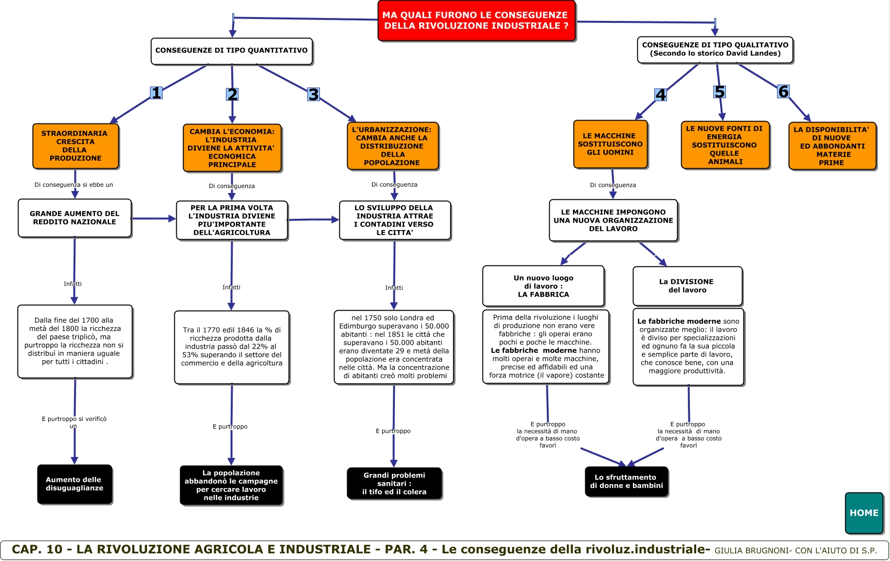 Questa Cmap, creata con IHMC CmapTools, contiene informazioni relative a: CAP. 10 - Par. 4, STRAORDINARIA CRESCITA DELLA PRODUZIONE Di conseguenza si ebbe un GRANDE AUMENTO DEL REDDITO NAZIONALE, GRANDE AUMENTO DEL REDDITO NAZIONALE PER LA PRIMA VOLTA L'INDUSTRIA DIVIENE PIU'IMPORTANTE DELL'AGRICOLTURA, CONSEGUENZE DI TIPO QUALITATIVO (Secondo lo storico David Landes) 4 LE MACCHINE SOSTITUISCONO GLI UOMINI, LO SVILUPPO DELLA INDUSTRIA ATTRAE I CONTADINI VERSO LE CITTA' Infatti nel 1750 solo Londra ed Edimburgo superavano i 50.000 abitanti : nel 1851 le città che superavano i 50.000 abitanti erano diventate 29 e metà della popolazione era concentrata nelle città. Ma la concentrazione di abitanti creò molti problemi, PER LA PRIMA VOLTA L'INDUSTRIA DIVIENE PIU'IMPORTANTE DELL'AGRICOLTURA LO SVILUPPO DELLA INDUSTRIA ATTRAE I CONTADINI VERSO LE CITTA', GRANDE AUMENTO DEL REDDITO NAZIONALE Infatti Dalla fine del 1700 alla metà del 1800 la ricchezza del paese triplicò, ma purtroppo la ricchezza non si distribuì in maniera uguale per tutti i cittadini ., CONSEGUENZE DI TIPO QUANTITATIVO 1 STRAORDINARIA CRESCITA DELLA PRODUZIONE, Dalla fine del 1700 alla metà del 1800 la ricchezza del paese triplicò, ma purtroppo la ricchezza non si distribuì in maniera uguale per tutti i cittadini . E purtroppo si verificò un Aumento delle disuguaglianze, CONSEGUENZE DI TIPO QUALITATIVO (Secondo lo storico David Landes) 5 LE NUOVE FONTI DI ENERGIA SOSTITUISCONO QUELLE ANIMALI, PER LA PRIMA VOLTA L'INDUSTRIA DIVIENE PIU'IMPORTANTE DELL'AGRICOLTURA Infatti Tra il 1770 edil 1846 la % di ricchezza prodotta dalla industria passò dal 22% al 53% superando il settore del commercio e della agricoltura, Tra il 1770 edil 1846 la % di ricchezza prodotta dalla industria passò dal 22% al 53% superando il settore del commercio e della agricoltura E purtroppo La popolazione abbandonò le campagne per cercare lavoro nelle industrie, L'URBANIZZAZIONE: CAMBIA ANCHE LA DISTRIBUZIONE DELLA POPOLAZIONE Di conseguenza LO SVILUPPO DELLA INDUSTRIA ATTRAE I CONTADINI VERSO LE CITTA', LE MACCHINE SOSTITUISCONO GLI UOMINI Di conseguenza LE MACCHINE IMPONGONO UNA NUOVA ORGANIZZAZIONE DEL LAVORO, CONSEGUENZE DI TIPO QUANTITATIVO 2 CAMBIA L'ECONOMIA: L'INDUSTRIA DIVIENE LA ATTIVITA' ECONOMICA PRINCIPALE, CONSEGUENZE DI TIPO QUALITATIVO (Secondo lo storico David Landes) 6 LA DISPONIBILITA' DI NUOVE ED ABBONDANTI MATERIE PRIME, LE MACCHINE IMPONGONO UNA NUOVA ORGANIZZAZIONE DEL LAVORO La DIVISIONE del lavoro, Prima della rivoluzione i luoghi di produzione non erano vere fabbriche : gli operai erano pochi e poche le macchine. Le fabbriche moderne hanno molti operai e molte macchine, precise ed affidabili ed una forza motrice (il vapore) costante E purtroppo la necessità di mano d'opera a basso costo favorì Lo sfruttamento di donne e bambini, Le fabbriche moderne sono organizzate meglio: il lavoro è diviso per specializzazioni ed ognuno fa la sua piccola e semplice parte di lavoro, che conosce bene, con una maggiore produttività. E purtroppo la necessità di mano d'opera a basso costo favorì Lo sfruttamento di donne e bambini, CONSEGUENZE DI TIPO QUANTITATIVO 3 L'URBANIZZAZIONE: CAMBIA ANCHE LA DISTRIBUZIONE DELLA POPOLAZIONE, CAMBIA L'ECONOMIA: L'INDUSTRIA DIVIENE LA ATTIVITA' ECONOMICA PRINCIPALE Di conseguenza PER LA PRIMA VOLTA L'INDUSTRIA DIVIENE PIU'IMPORTANTE DELL'AGRICOLTURA