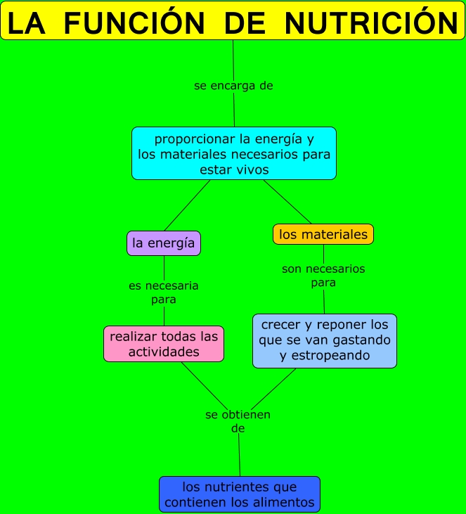 Este Cmap, tiene información relacionada con: La función de nutrición, proporcionar la energía y los materiales necesarios para estar vivos los materiales, crecer y reponer los que se van gastando y estropeando se obtienen de los nutrientes que contienen los alimentos, LA FUNCIÓN DE NUTRICIÓN se encarga de proporcionar la energía y los materiales necesarios para estar vivos, realizar todas las actividades se obtienen de los nutrientes que contienen los alimentos, los materiales son necesarios para crecer y reponer los que se van gastando y estropeando, proporcionar la energía y los materiales necesarios para estar vivos la energía, la energía es necesaria para realizar todas las actividades