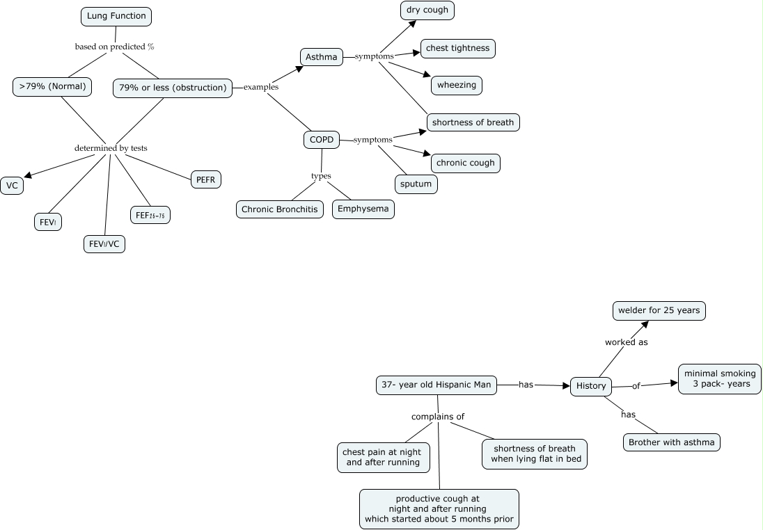 This Concept Map, created with IHMC CmapTools, has information related to: Week 8, Assignment 1, 37- year old Hispanic Man has History, 37- year old Hispanic Man complains of chest pain at night and after running, Lung Function based on predicted % ᢇ% (Normal), ᢇ% (Normal) determined by tests FEV1, COPD symptoms shortness of breath, 37- year old Hispanic Man complains of productive cough at night and after running which started about 5 months prior, COPD symptoms chronic cough, ᢇ% (Normal) determined by tests VC, Asthma symptoms shortness of breath, History of minimal smoking 3 pack- years, ᢇ% (Normal) determined by tests PEFR, History worked as welder for 25 years, Asthma symptoms dry cough, Asthma symptoms wheezing, 79% or less (obstruction) determined by tests PEFR, 37- year old Hispanic Man complains of shortness of breath when lying flat in bed, Asthma symptoms chest tightness, COPD symptoms sputum, 79% or less (obstruction) determined by tests FEV1/VC, 79% or less (obstruction) examples COPD