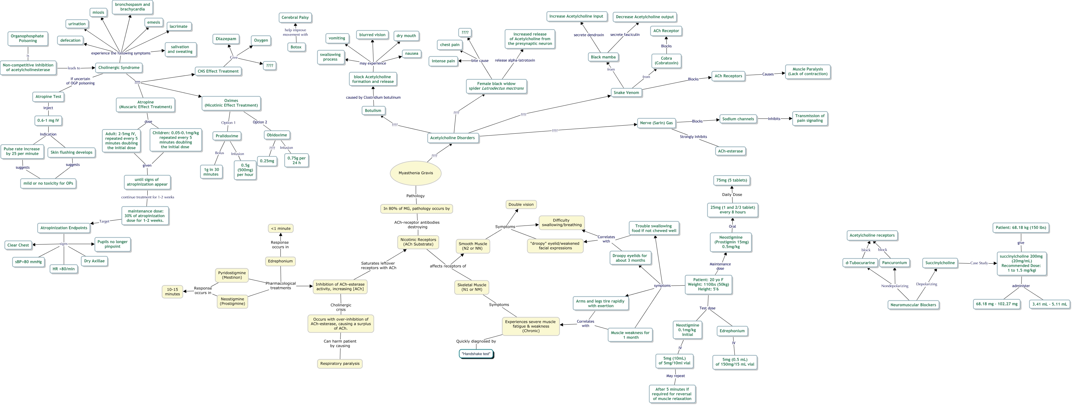 This Concept Map, created with IHMC CmapTools, has information related to: Untitled, In 80% of MG, pathology occurs by ACh-receptor antibodies destroying Nicotinic Receptors (ACh Substrate), Cholinergic Syndrome ???? CNS Effect Treatment, Female black widow spider Latrodectus mactrans bite cause ????, Neostigmine 0.1mg/kg Initial IV 5mg (10mL) of 5mg/10ml vial, Nicotinic Receptors (ACh Substrate) affects receptors of Skeletal Muscle (N1 or NM), Patient: 20 yo F Weight: 110lbs (50kg) Height: 5'6 Test dose Edrephonium, Female black widow spider Latrodectus mactrans bite cause chest pain, Pyridostigmine (Mestinon) Response occurs in 10-15 minutes, Cholinergic Syndrome experience the following symptoms lacrimate, Pyridostigmine (Mestinon) Pharmacological treatments Inhibition of ACh-esterase activity, increasing [ACh], Acetylcholine Disorders ???? Female black widow spider Latrodectus mactrans, block Acetylcholine formation and release may experience vomiting, Nerve (Sarin) Gas Strongly Inhibits ACh-esterase, Patient: 20 yo F Weight: 110lbs (50kg) Height: 5'6 symptoms Muscle weakness for 1 month, Arms and legs tire rapidly with exertion Correlates with Experiences severe muscle fatigue & weakness (Chronic), Skeletal Muscle (N1 or NM) Symptoms Experiences severe muscle fatigue & weakness (Chronic), Inhibition of ACh-esterase activity, increasing [ACh] Saturates leftover receptors with ACh Nicotinic Receptors (ACh Substrate), block Acetylcholine formation and release may experience dry mouth, Neostigmine (Prostigmin 15mg) 0.5mg/kg Oral 25mg (1 and 2/3 tablet) every 8 hours, Patient: 20 yo F Weight: 110lbs (50kg) Height: 5'6 symptoms Arms and legs tire rapidly with exertion