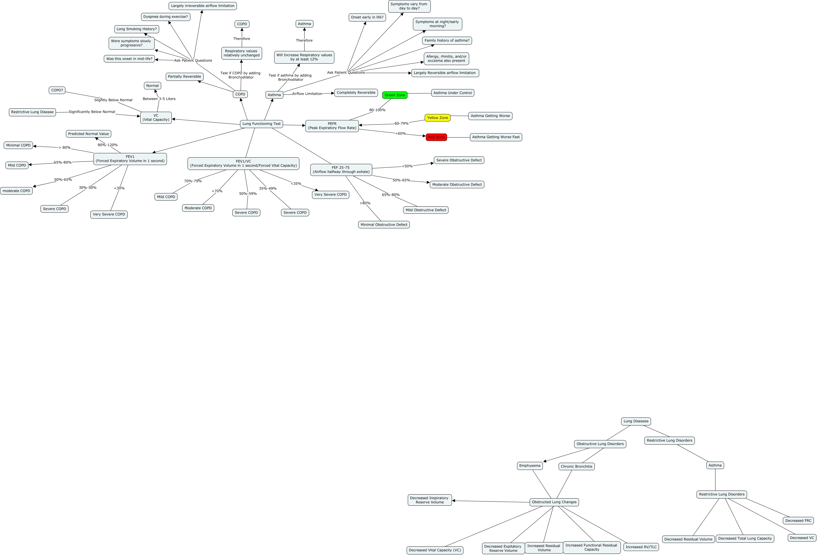 This Concept Map, created with IHMC CmapTools, has information related to: Respiratory, COPD Ask Patient Questions Long Smoking History?, Asthma Ask Patient Questions Allergy, rhinitis, and/or ecczema also present, Obstructed Lung Changes ???? Increased Functional Residual Capacity, Chronic Bronchitis ???? Obstructed Lung Changes, Yellow Zone 60-79% PEFR (Peak Expiratory Flow Rate), Lung Functioning Test ???? Asthma, Obstructed Lung Changes ???? Decreased Inspiratory Reserve Volume, Lung Functioning Test ???? PEFR (Peak Expiratory Flow Rate), Asthma Getting Worse Fast ???? Red Zone, COPD Ask Patient Questions Were symptoms slowly progressive?, Will Increase Respiratory values by at least 12% Therefore Asthma, Asthma ???? Restrictive Lung Disorders, Asthma Test if asthma by adding Bronchodilator Will Increase Respiratory values by at least 12%, COPD Test if COPD by adding Bronchodilator Respiratory values relatively unchanged, Obstructive Lung Disorders ???? Chronic Bronchitis, FEV1 (Forced Expiratory Volume in 1 second) 65%-80% Mild COPD, Asthma Ask Patient Questions Largely Reversible airflow limitation, Green Zone 80-100% PEFR (Peak Expiratory Flow Rate), Obstructive Lung Disorders ???? Emphysema, Asthma Getting Worse ???? Yellow Zone