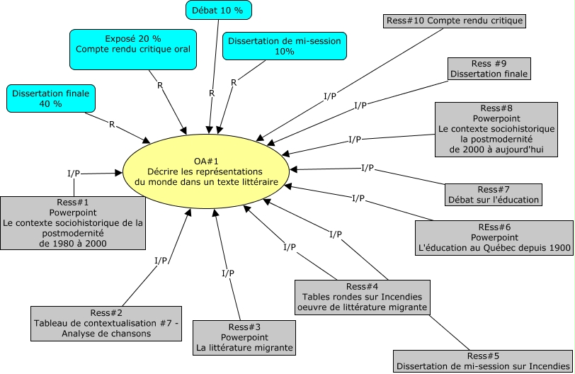 Cette carte de concepts créée avec IHMC CmapTools traite de: OA1, Ress#5 Dissertation de mi-session sur Incendies I/P OA#1 Décrire les représentations du monde dans un texte littéraire, Ress #9 Dissertation finale I/P OA#1 Décrire les représentations du monde dans un texte littéraire, Dissertation finale 40 % R OA#1 Décrire les représentations du monde dans un texte littéraire, Ress#8 Powerpoint Le contexte sociohistorique la postmodernité de 2000 à aujourd'hui I/P OA#1 Décrire les représentations du monde dans un texte littéraire, Ress#2 Tableau de contextualisation #7 - Analyse de chansons I/P OA#1 Décrire les représentations du monde dans un texte littéraire, Ress#10 Compte rendu critique I/P OA#1 Décrire les représentations du monde dans un texte littéraire, Exposé 20 % Compte rendu critique oral R OA#1 Décrire les représentations du monde dans un texte littéraire, Ress#3 Powerpoint La littérature migrante I/P OA#1 Décrire les représentations du monde dans un texte littéraire, Ress#7 Débat sur l'éducation I/P OA#1 Décrire les représentations du monde dans un texte littéraire, Dissertation de mi-session 10% R OA#1 Décrire les représentations du monde dans un texte littéraire, REss#6 Powerpoint L'éducation au Québec depuis 1900 I/P OA#1 Décrire les représentations du monde dans un texte littéraire, Ress#4 Tables rondes sur Incendies oeuvre de littérature migrante I/P OA#1 Décrire les représentations du monde dans un texte littéraire, Ress#1 Powerpoint Le contexte sociohistorique de la postmodernité de 1980 à 2000 I/P OA#1 Décrire les représentations du monde dans un texte littéraire, Débat 10 % R OA#1 Décrire les représentations du monde dans un texte littéraire