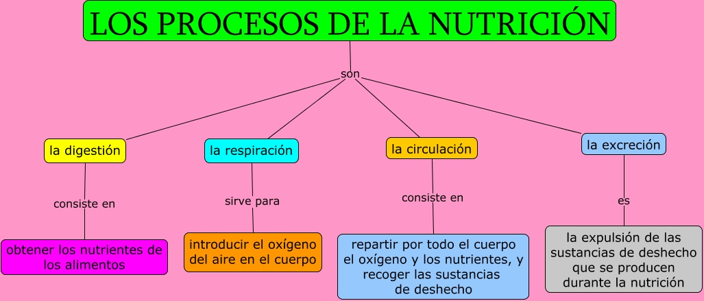Este Cmap, tiene información relacionada con: Los procesos de la nutrición, la circulación consiste en repartir por todo el cuerpo el oxígeno y los nutrientes, y recoger las sustancias de deshecho, LOS PROCESOS DE LA NUTRICIÓN son la respiración, LOS PROCESOS DE LA NUTRICIÓN son la digestión, LOS PROCESOS DE LA NUTRICIÓN son la excreción, la respiración sirve para introducir el oxígeno del aire en el cuerpo, LOS PROCESOS DE LA NUTRICIÓN son la circulación, la digestión consiste en obtener los nutrientes de los alimentos, la excreción es la expulsión de las sustancias de deshecho que se producen durante la nutrición