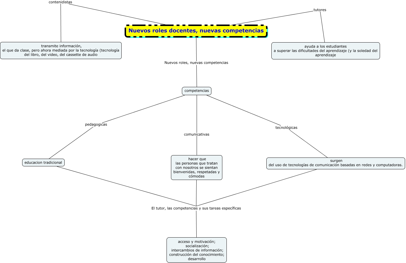 Este Cmap, tiene información relacionada con: roles, competencias comunicativas hacer que las personas que tratan con nosotros se sientan bienvenidas, respetadas y cómodas, educacion tradicional El tutor, las competencias y sus tareas específicas acceso y motivación; socialización; intercambios de información; construcción del conocimiento; desarrollo, surgen del uso de tecnologías de comunicación basadas en redes y computadoras. El tutor, las competencias y sus tareas específicas acceso y motivación; socialización; intercambios de información; construcción del conocimiento; desarrollo, Nuevos roles docentes, nuevas competencias tutores ayuda a los estudiantes a superar las dificultades del aprendizaje (y la soledad del aprendizaje, Nuevos roles docentes, nuevas competencias contenidistas transmite información, el que da clase, pero ahora mediada por la tecnología (tecnología del libro, del video, del cassette de audio, hacer que las personas que tratan con nosotros se sientan bienvenidas, respetadas y cómodas El tutor, las competencias y sus tareas específicas acceso y motivación; socialización; intercambios de información; construcción del conocimiento; desarrollo, competencias pedagogicas educacion tradicional, Nuevos roles docentes, nuevas competencias Nuevos roles, nuevas competencias competencias, competencias tecnológicas surgen del uso de tecnologías de comunicación basadas en redes y computadoras.
