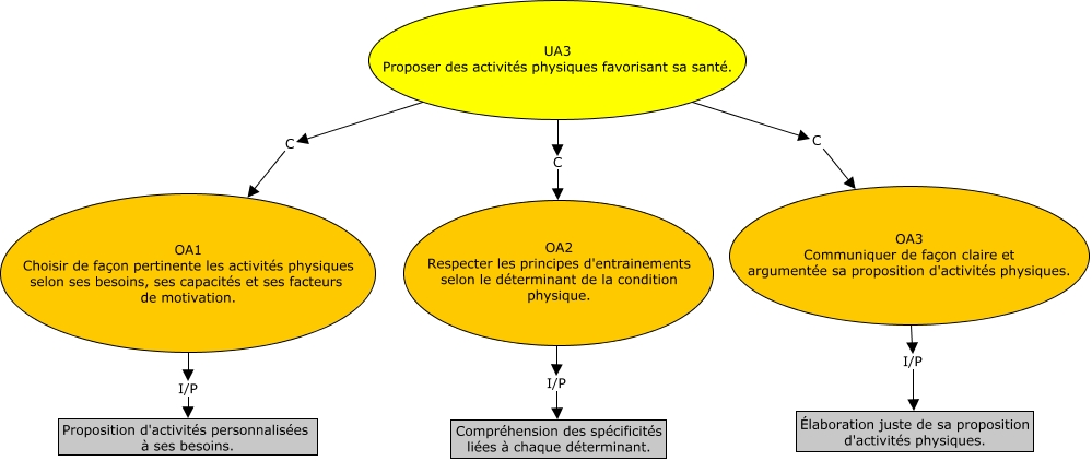 Cette carte de concepts créée avec IHMC CmapTools traite de: UA3, UA3 Proposer des activités physiques favorisant sa santé. C OA1 Choisir de façon pertinente les activités physiques selon ses besoins, ses capacités et ses facteurs de motivation., OA3 Communiquer de façon claire et argumentée sa proposition d'activités physiques. I/P Élaboration juste de sa proposition d'activités physiques., OA2 Respecter les principes d'entrainements selon le déterminant de la condition physique. I/P Compréhension des spécificités liées à chaque déterminant., UA3 Proposer des activités physiques favorisant sa santé. C OA2 Respecter les principes d'entrainements selon le déterminant de la condition physique., OA1 Choisir de façon pertinente les activités physiques selon ses besoins, ses capacités et ses facteurs de motivation. I/P Proposition d'activités personnalisées à ses besoins., UA3 Proposer des activités physiques favorisant sa santé. C OA3 Communiquer de façon claire et argumentée sa proposition d'activités physiques.