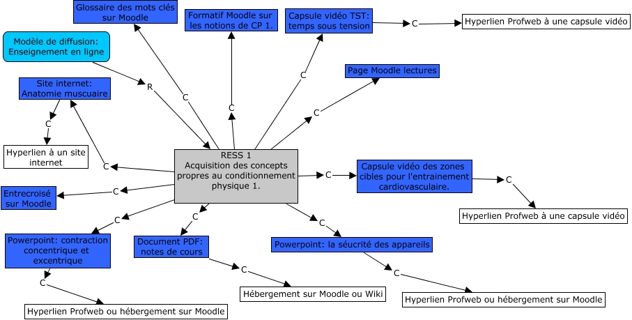 Cette carte de concepts créée avec IHMC CmapTools traite de: RESS 1, RESS 1 Acquisition des concepts propres au conditionnement physique 1. C Capsule vidéo TST: temps sous tension, Document PDF: notes de cours C Hébergement sur Moodle ou Wiki, Powerpoint: contraction concentrique et excentrique C Hyperlien Profweb ou hébergement sur Moodle, RESS 1 Acquisition des concepts propres au conditionnement physique 1. C Glossaire des mots clés sur Moodle, RESS 1 Acquisition des concepts propres au conditionnement physique 1. C Site internet: Anatomie muscuaire, RESS 1 Acquisition des concepts propres au conditionnement physique 1. C Capsule vidéo des zones cibles pour l'entrainement cardiovasculaire., RESS 1 Acquisition des concepts propres au conditionnement physique 1. C Powerpoint: la séucrité des appareils, RESS 1 Acquisition des concepts propres au conditionnement physique 1. C Entrecroisé sur Moodle, RESS 1 Acquisition des concepts propres au conditionnement physique 1. C Page Moodle lectures, RESS 1 Acquisition des concepts propres au conditionnement physique 1. C Powerpoint: contraction concentrique et excentrique, Site internet: Anatomie muscuaire C Hyperlien à un site internet, Modèle de diffusion: Enseignement en ligne R RESS 1 Acquisition des concepts propres au conditionnement physique 1., Powerpoint: la séucrité des appareils C Hyperlien Profweb ou hébergement sur Moodle, RESS 1 Acquisition des concepts propres au conditionnement physique 1. C Document PDF: notes de cours, RESS 1 Acquisition des concepts propres au conditionnement physique 1. C Formatif Moodle sur les notions de CP 1., Capsule vidéo TST: temps sous tension C Hyperlien Profweb à une capsule vidéo, Capsule vidéo des zones cibles pour l'entrainement cardiovasculaire. C Hyperlien Profweb à une capsule vidéo