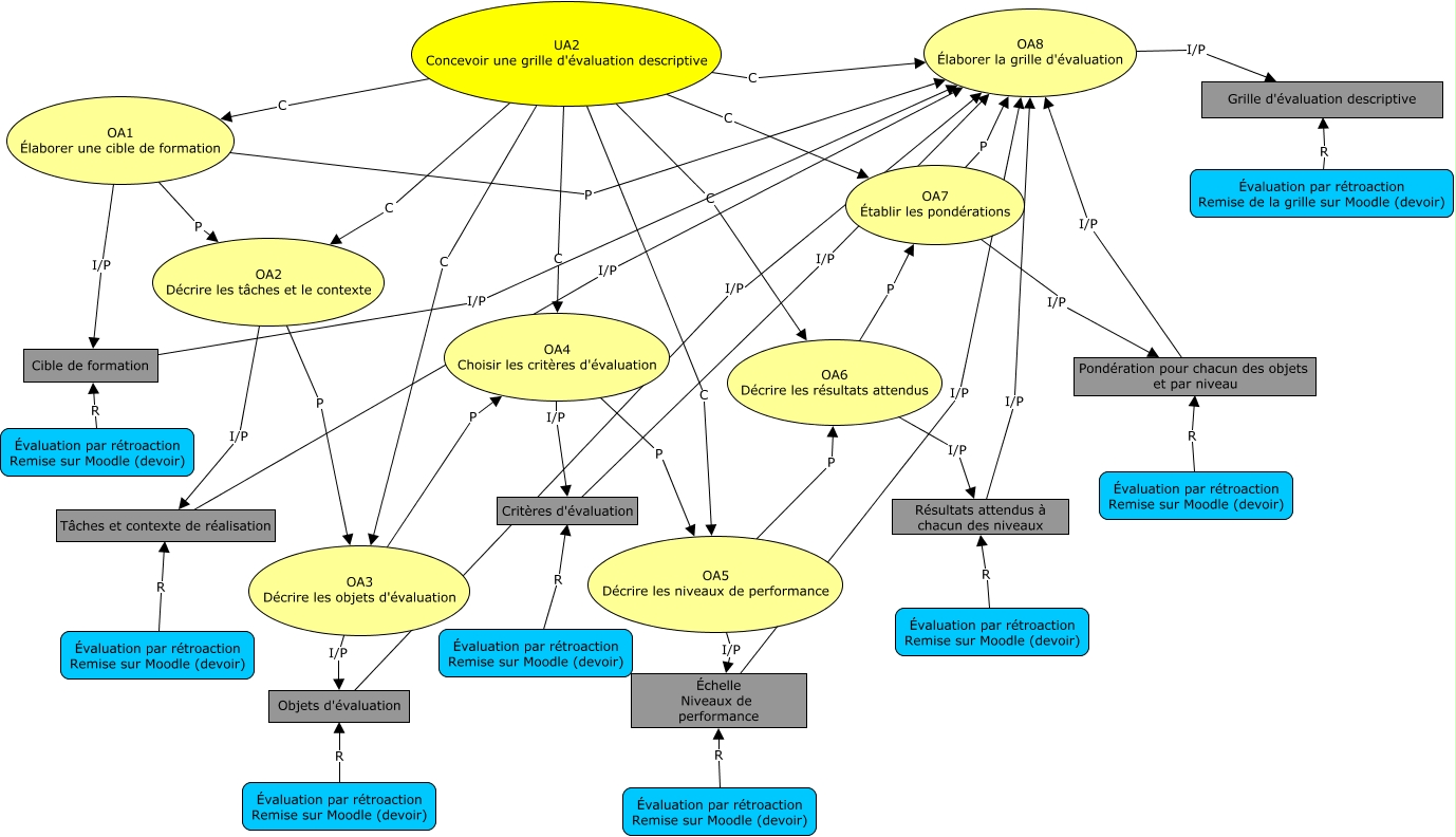 Cette carte de concepts créée avec IHMC CmapTools traite de: UA2, UA2 Concevoir une grille d'évaluation descriptive C OA1 Élaborer une cible de formation, Évaluation par rétroaction Remise sur Moodle (devoir) R Critères d'évaluation, OA5 Décrire les niveaux de performance I/P Échelle Niveaux de performance, OA4 Choisir les critères d'évaluation I/P Critères d'évaluation, OA3 Décrire les objets d'évaluation I/P Objets d'évaluation, UA2 Concevoir une grille d'évaluation descriptive C OA2 Décrire les tâches et le contexte, OA3 Décrire les objets d'évaluation P OA4 Choisir les critères d'évaluation, UA2 Concevoir une grille d'évaluation descriptive C OA7 Établir les pondérations, Évaluation par rétroaction Remise sur Moodle (devoir) R Résultats attendus à chacun des niveaux, Évaluation par rétroaction Remise sur Moodle (devoir) R Tâches et contexte de réalisation, OA2 Décrire les tâches et le contexte I/P Tâches et contexte de réalisation, OA4 Choisir les critères d'évaluation P OA5 Décrire les niveaux de performance, OA1 Élaborer une cible de formation I/P Cible de formation, OA7 Établir les pondérations P OA8 Élaborer la grille d'évaluation, UA2 Concevoir une grille d'évaluation descriptive C OA4 Choisir les critères d'évaluation, Objets d'évaluation I/P OA8 Élaborer la grille d'évaluation, Résultats attendus à chacun des niveaux I/P OA8 Élaborer la grille d'évaluation, Évaluation par rétroaction Remise sur Moodle (devoir) R Objets d'évaluation, OA6 Décrire les résultats attendus I/P Résultats attendus à chacun des niveaux, UA2 Concevoir une grille d'évaluation descriptive C OA6 Décrire les résultats attendus