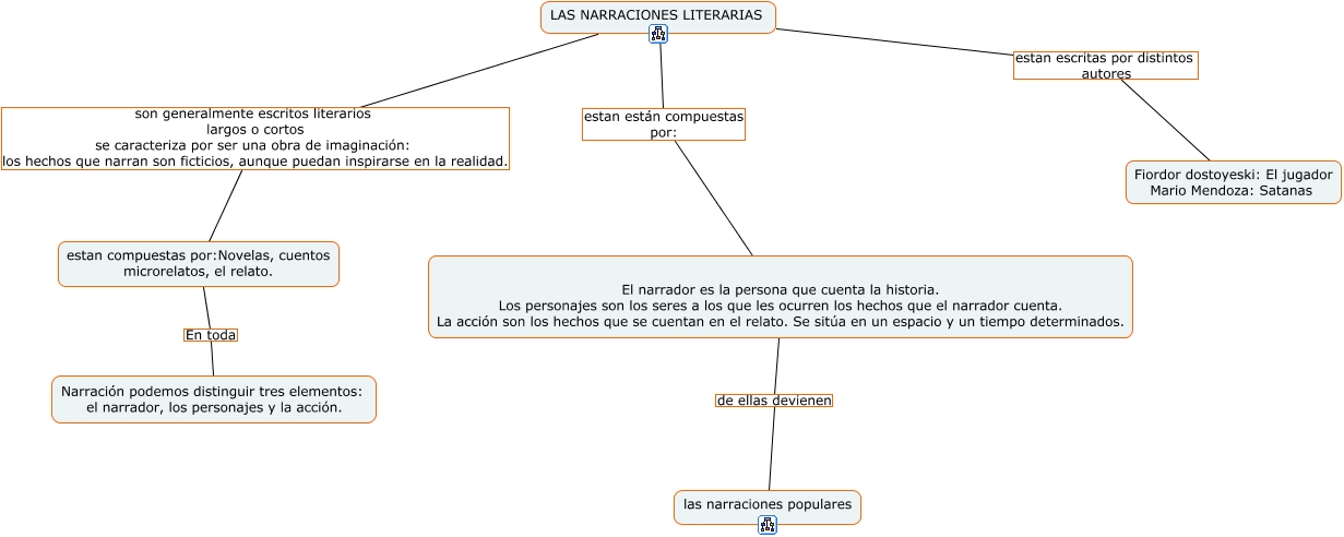 Este Cmap, tiene información relacionada con: Sin Título 1, El narrador es la persona que cuenta la historia. Los personajes son los seres a los que les ocurren los hechos que el narrador cuenta. La acción son los hechos que se cuentan en el relato. Se sitúa en un espacio y un tiempo determinados. de ellas devienen las narraciones populares, estan compuestas por:Novelas, cuentos microrelatos, el relato. En toda Narración podemos distinguir tres elementos: el narrador, los personajes y la acción., LAS NARRACIONES LITERARIAS estan están compuestas por: El narrador es la persona que cuenta la historia. Los personajes son los seres a los que les ocurren los hechos que el narrador cuenta. La acción son los hechos que se cuentan en el relato. Se sitúa en un espacio y un tiempo determinados., LAS NARRACIONES LITERARIAS estan escritas por distintos autores Fiordor dostoyeski: El jugador Mario Mendoza: Satanas, LAS NARRACIONES LITERARIAS son generalmente escritos literarios largos o cortos se caracteriza por ser una obra de imaginación: los hechos que narran son ficticios, aunque puedan inspirarse en la realidad. estan compuestas por:Novelas, cuentos microrelatos, el relato.