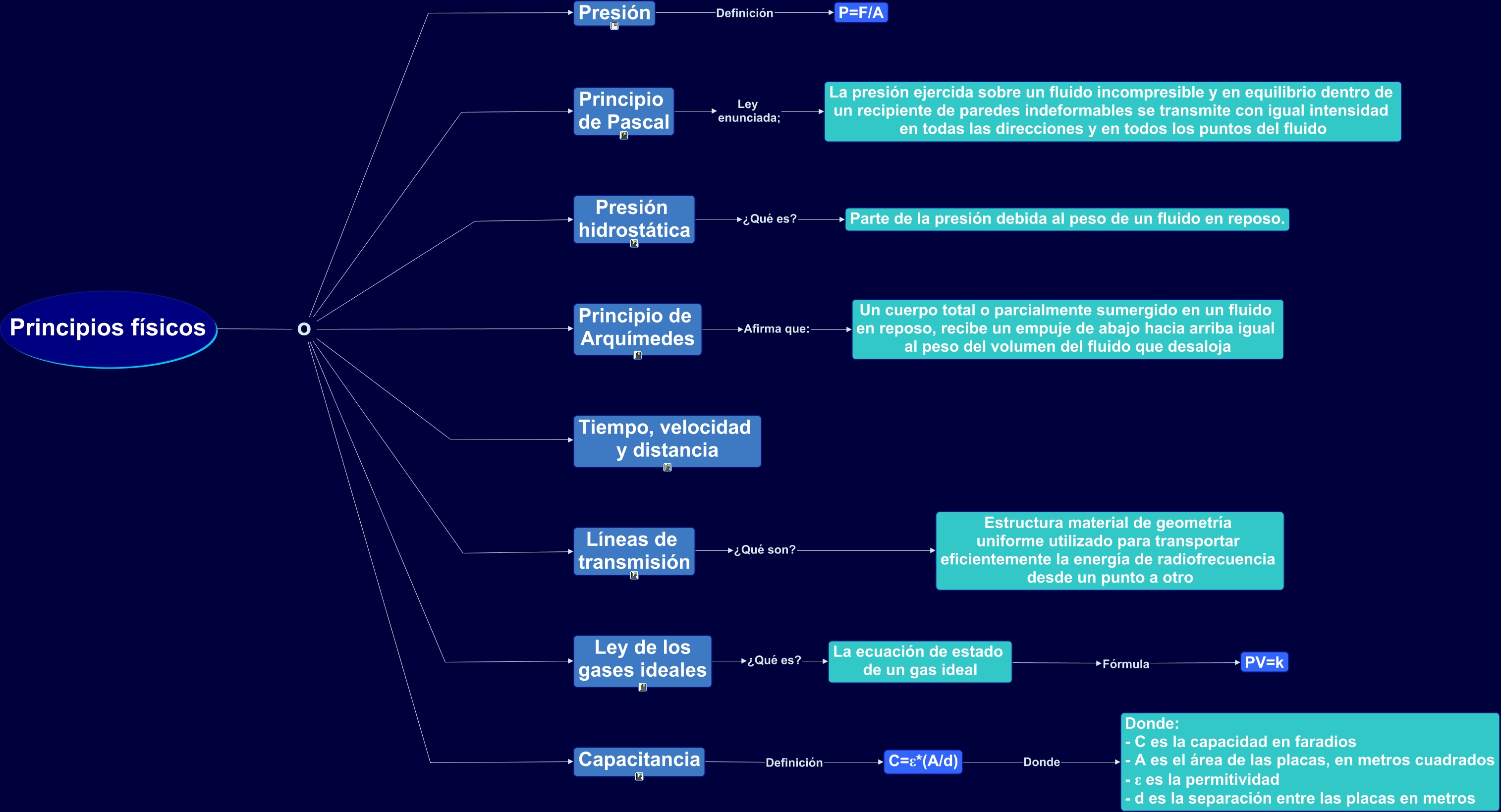 Este Cmap, tiene información relacionada con: PRINCIPIOS, Presión Definición P=F/A, Principios físicos o Presión, Principio de Pascal Ley enunciada; La presión ejercida sobre un fluido incompresible y en equilibrio dentro de un recipiente de paredes indeformables se transmite con igual intensidad en todas las direcciones y en todos los puntos del fluido, Principios físicos o Principio de Pascal, Principios físicos o Tiempo, velocidad y distancia, C=ε*(A/d) Donde Donde: - C es la capacidad en faradios - A es el área de las placas, en metros cuadrados - ε es la permitividad - d es la separación entre las placas en metros, Capacitancia Definición C=ε*(A/d), Líneas de transmisión ¿Qué son? Estructura material de geometría uniforme utilizado para transportar eficientemente la energía de radiofrecuencia desde un punto a otro, Principios físicos o Capacitancia, Principios físicos o Principio de Arquímedes, Principios físicos o Presión hidrostática, Principios físicos o Líneas de transmisión, Principio de Arquímedes Afirma que: Un cuerpo total o parcialmente sumergido en un fluido en reposo, recibe un empuje de abajo hacia arriba igual al peso del volumen del fluido que desaloja, Principios físicos o Ley de los gases ideales, Ley de los gases ideales ¿Qué es? La ecuación de estado de un gas ideal, La ecuación de estado de un gas ideal Fórmula PV=k, Presión hidrostática ¿Qué es? Parte de la presión debida al peso de un fluido en reposo.