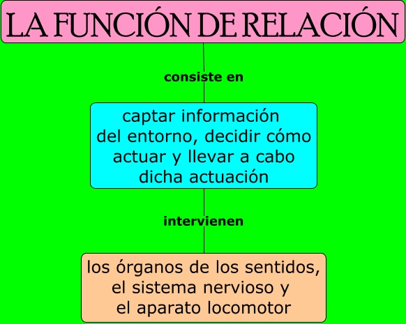 Este Cmap, tiene información relacionada con: La función de relación, captar información del entorno, decidir cómo actuar y llevar a cabo dicha actuación intervienen los órganos de los sentidos, el sistema nervioso y el aparato locomotor, LA FUNCIÓN DE RELACIÓN consiste en captar información del entorno, decidir cómo actuar y llevar a cabo dicha actuación