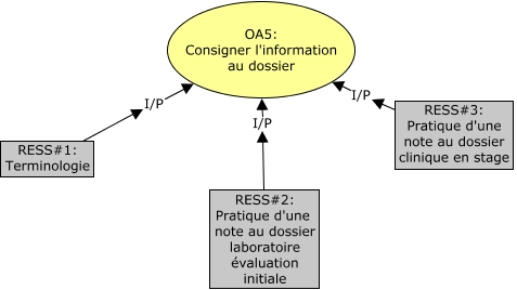 Cette carte de concepts créée avec IHMC CmapTools traite de: Ressource pédagogique OA5, RESS#1: Terminologie I/P OA5: Consigner l'information au dossier, RESS#2: Pratique d'une note au dossier laboratoire évaluation initiale I/P OA5: Consigner l'information au dossier, RESS#3: Pratique d'une note au dossier clinique en stage I/P OA5: Consigner l'information au dossier