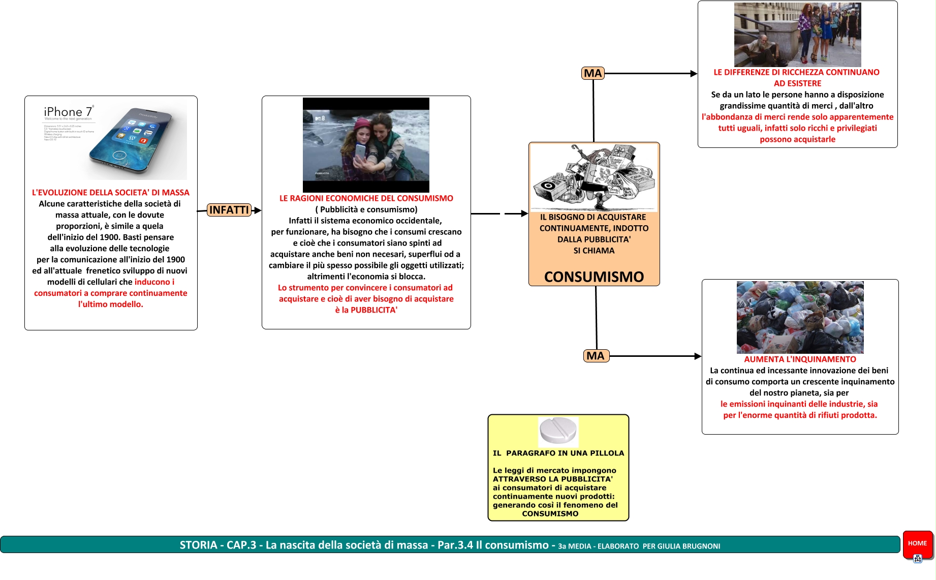 Questa Cmap, creata con IHMC CmapTools, contiene informazioni relative a: STORIA - Par.3.4 - Il consumismo - GB 3a media, IL BISOGNO DI ACQUISTARE CONTINUAMENTE, INDOTTO DALLA PUBBLICITA' SI CHIAMA CONSUMISMO MA AUMENTA L'INQUINAMENTO La continua ed incessante innovazione dei beni di consumo comporta un crescente inquinamento del nostro pianeta, sia per le emissioni inquinanti delle industrie, sia per l'enorme quantità di rifiuti prodotta., IL BISOGNO DI ACQUISTARE CONTINUAMENTE, INDOTTO DALLA PUBBLICITA' SI CHIAMA CONSUMISMO MA LE DIFFERENZE DI RICCHEZZA CONTINUANO AD ESISTERE Se da un lato le persone hanno a disposizione grandissime quantità di merci , dall'altro l'abbondanza di merci rende solo apparentemente tutti uguali, infatti solo ricchi e privilegiati possono acquistarle, L'EVOLUZIONE DELLA SOCIETA' DI MASSA Alcune caratteristiche della società di massa attuale, con le dovute proporzioni, è simile a quela dell'inizio del 1900. Basti pensare alla evoluzione delle tecnologie per la comunicazione all'inizio del 1900 ed all'attuale frenetico sviluppo di nuovi modelli di cellulari che inducono i consumatori a comprare continuamente l'ultimo modello. INFATTI LE RAGIONI ECONOMICHE DEL CONSUMISMO ( Pubblicità e consumismo) Infatti il sistema economico occidentale, per funzionare, ha bisogno che i consumi crescano e cioè che i consumatori siano spinti ad acquistare anche beni non necesari, superflui od a cambiare il più spesso possibile gli oggetti utilizzati; altrimenti l'economia si blocca. Lo strumento per convincere i consumatori ad acquistare e cioè di aver bisogno di acquistare è la PUBBLICITA', LE RAGIONI ECONOMICHE DEL CONSUMISMO ( Pubblicità e consumismo) Infatti il sistema economico occidentale, per funzionare, ha bisogno che i consumi crescano e cioè che i consumatori siano spinti ad acquistare anche beni non necesari, superflui od a cambiare il più spesso possibile gli oggetti utilizzati; altrimenti l'economia si blocca. Lo strumento per convincere i consumatori ad acquistare e cioè di aver bisogno di acquistare è la PUBBLICITA' IL BISOGNO DI ACQUISTARE CONTINUAMENTE, INDOTTO DALLA PUBBLICITA' SI CHIAMA CONSUMISMO