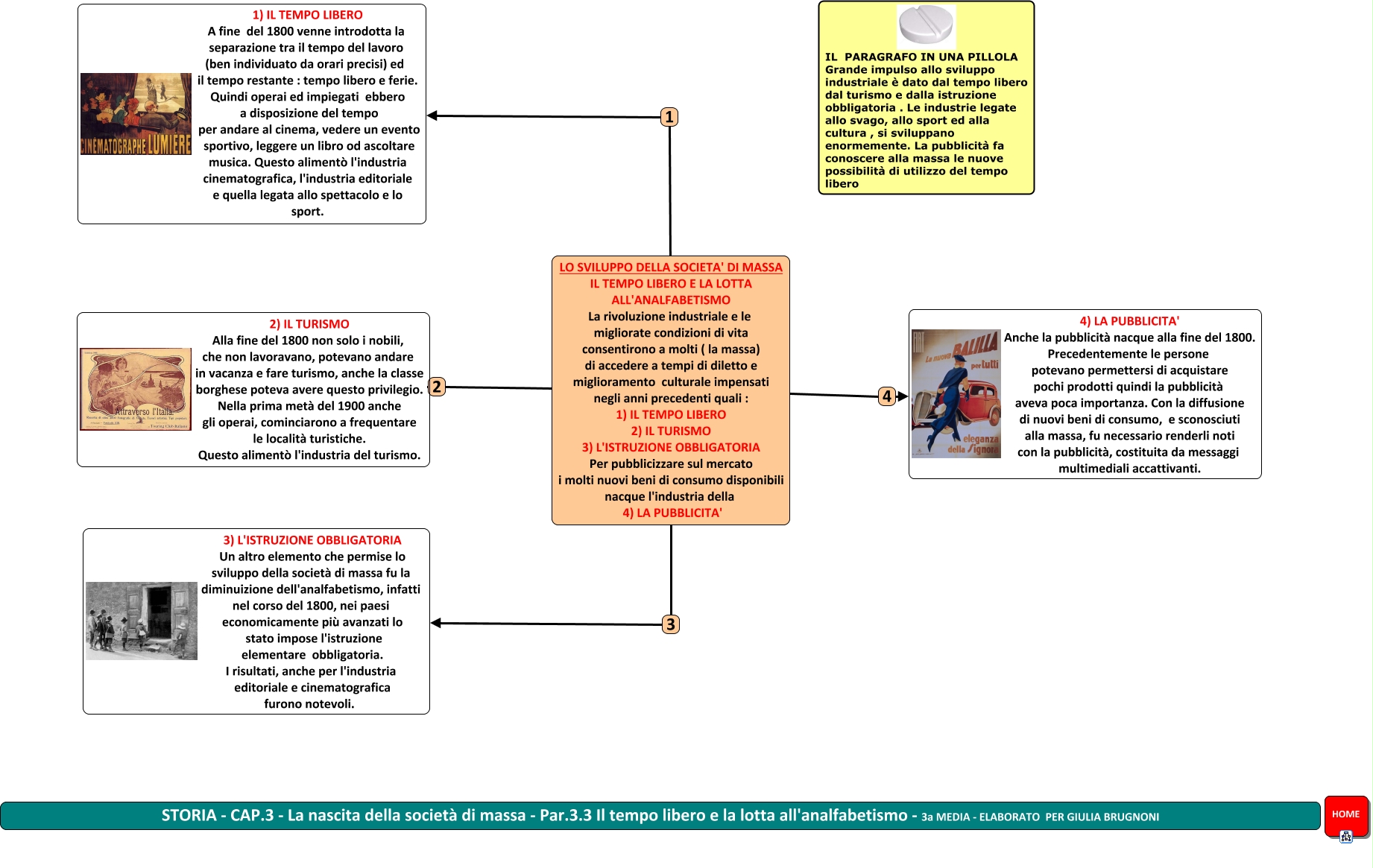 Questa Cmap, creata con IHMC CmapTools, contiene informazioni relative a: STORIA - Par.3.3 - Il tempo libero e la lotta all'analfabetismo - GB 3a media, LO SVILUPPO DELLA SOCIETA' DI MASSA IL TEMPO LIBERO E LA LOTTA ALL'ANALFABETISMO La rivoluzione industriale e le migliorate condizioni di vita consentirono a molti ( la massa) di accedere a tempi di diletto e miglioramento culturale impensati negli anni precedenti quali : 1) IL TEMPO LIBERO 2) IL TURISMO 3) L'ISTRUZIONE OBBLIGATORIA Per pubblicizzare sul mercato i molti nuovi beni di consumo disponibili nacque l'industria della 4) LA PUBBLICITA' 1 1) IL TEMPO LIBERO A fine del 1800 venne introdotta la separazione tra il tempo del lavoro (ben individuato da orari precisi) ed il tempo restante : tempo libero e ferie. Quindi operai ed impiegati ebbero a disposizione del tempo per andare al cinema, vedere un evento sportivo, leggere un libro od ascoltare musica. Questo alimentò l'industria cinematografica, l'industria editoriale e quella legata allo spettacolo e lo sport., LO SVILUPPO DELLA SOCIETA' DI MASSA IL TEMPO LIBERO E LA LOTTA ALL'ANALFABETISMO La rivoluzione industriale e le migliorate condizioni di vita consentirono a molti ( la massa) di accedere a tempi di diletto e miglioramento culturale impensati negli anni precedenti quali : 1) IL TEMPO LIBERO 2) IL TURISMO 3) L'ISTRUZIONE OBBLIGATORIA Per pubblicizzare sul mercato i molti nuovi beni di consumo disponibili nacque l'industria della 4) LA PUBBLICITA' 4 4) LA PUBBLICITA' Anche la pubblicità nacque alla fine del 1800. Precedentemente le persone potevano permettersi di acquistare pochi prodotti quindi la pubblicità aveva poca importanza. Con la diffusione di nuovi beni di consumo, e sconosciuti alla massa, fu necessario renderli noti con la pubblicità, costituita da messaggi multimediali accattivanti., LO SVILUPPO DELLA SOCIETA' DI MASSA IL TEMPO LIBERO E LA LOTTA ALL'ANALFABETISMO La rivoluzione industriale e le migliorate condizioni di vita consentirono a molti ( la massa) di accedere a tempi di diletto e miglioramento culturale impensati negli anni precedenti quali : 1) IL TEMPO LIBERO 2) IL TURISMO 3) L'ISTRUZIONE OBBLIGATORIA Per pubblicizzare sul mercato i molti nuovi beni di consumo disponibili nacque l'industria della 4) LA PUBBLICITA' 3 3) L'ISTRUZIONE OBBLIGATORIA Un altro elemento che permise lo sviluppo della società di massa fu la diminuizione dell'analfabetismo, infatti nel corso del 1800, nei paesi economicamente più avanzati lo stato impose l'istruzione elementare obbligatoria. I risultati, anche per l'industria editoriale e cinematografica furono notevoli., LO SVILUPPO DELLA SOCIETA' DI MASSA IL TEMPO LIBERO E LA LOTTA ALL'ANALFABETISMO La rivoluzione industriale e le migliorate condizioni di vita consentirono a molti ( la massa) di accedere a tempi di diletto e miglioramento culturale impensati negli anni precedenti quali : 1) IL TEMPO LIBERO 2) IL TURISMO 3) L'ISTRUZIONE OBBLIGATORIA Per pubblicizzare sul mercato i molti nuovi beni di consumo disponibili nacque l'industria della 4) LA PUBBLICITA' 2 2) IL TURISMO Alla fine del 1800 non solo i nobili, che non lavoravano, potevano andare in vacanza e fare turismo, anche la classe borghese poteva avere questo privilegio. Nella prima metà del 1900 anche gli operai, cominciarono a frequentare le località turistiche. Questo alimentò l'industria del turismo.
