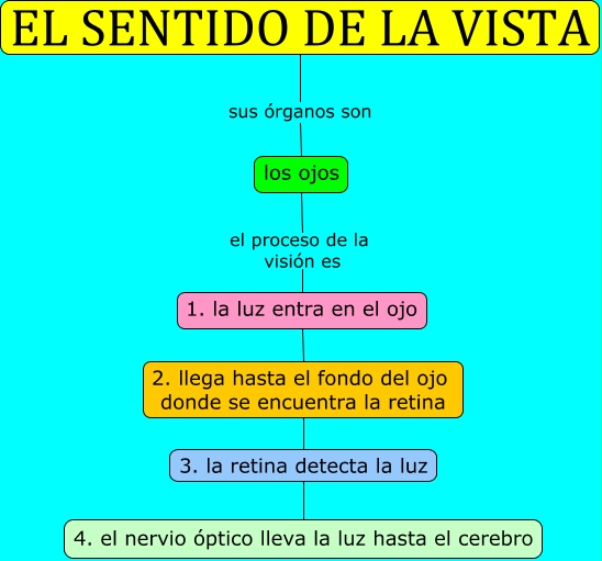Este Cmap, tiene información relacionada con: El sentido de la vista, 2. llega hasta el fondo del ojo donde se encuentra la retina 3. la retina detecta la luz, 3. la retina detecta la luz 4. el nervio óptico lleva la luz hasta el cerebro, EL SENTIDO DE LA VISTA sus órganos son los ojos, los ojos el proceso de la visión es 1. la luz entra en el ojo, 1. la luz entra en el ojo 2. llega hasta el fondo del ojo donde se encuentra la retina