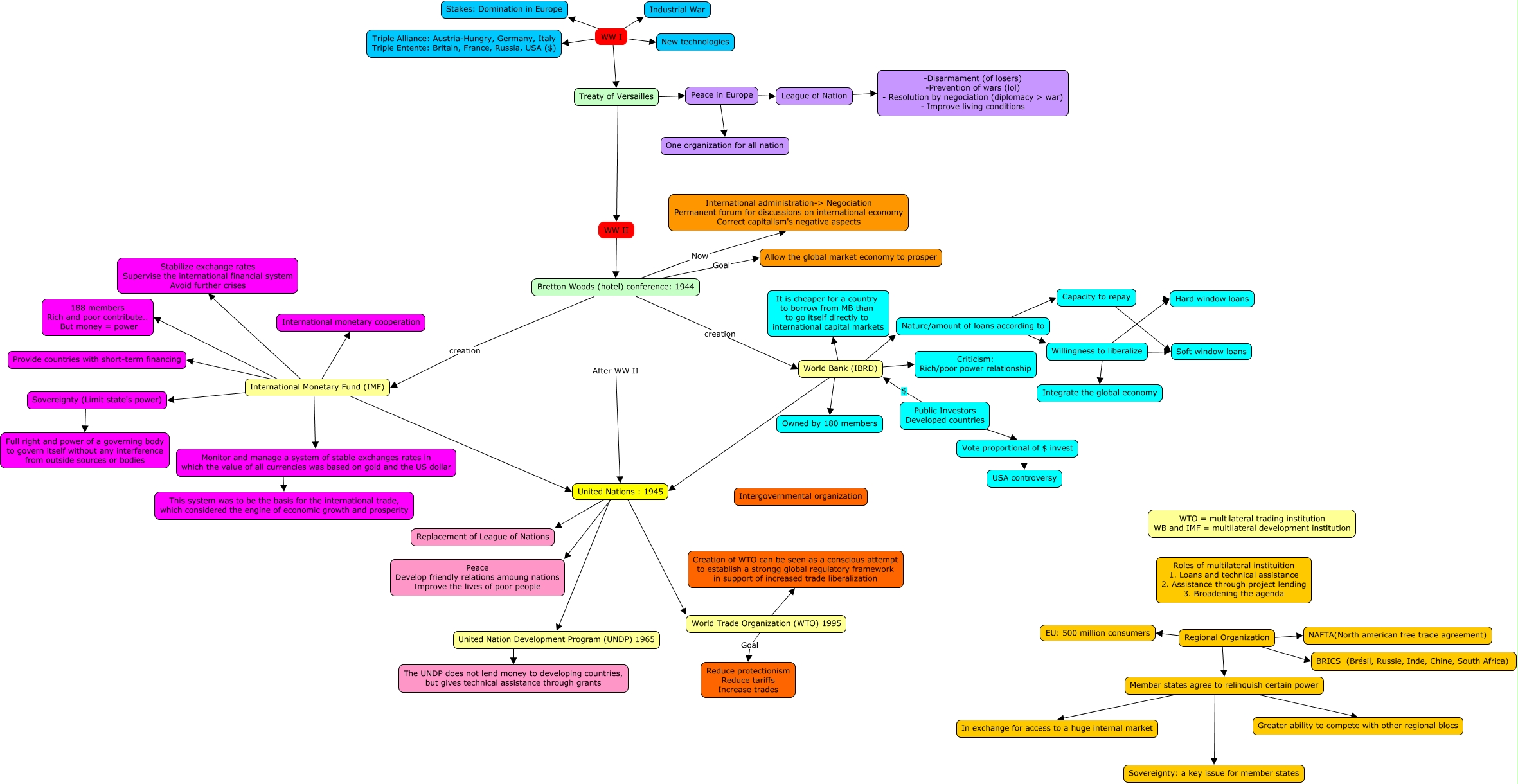 Cette carte de concepts créée avec IHMC CmapTools traite de: Séance 6, WW I ???? Triple Alliance: Austria-Hungry, Germany, Italy Triple Entente: Britain, France, Russia, USA ($), International Monetary Fund (IMF) ???? Provide countries with short-term financing, International Monetary Fund (IMF) ???? United Nations : 1945, International Monetary Fund (IMF) ???? International monetary cooperation, Bretton Woods (hotel) conference: 1944 creation World Bank (IBRD), United Nation Development Program (UNDP) 1965 ???? The UNDP does not lend money to developing countries, but gives technical assistance through grants, Member states agree to relinquish certain power ???? Sovereignty: a key issue for member states, Peace in Europe ???? League of Nation, World Bank (IBRD) ???? Owned by 180 members, Regional Organization ???? EU: 500 million consumers, Sovereignty (Limit state's power) ???? Full right and power of a governing body to govern itself without any interference from outside sources or bodies, Treaty of Versailles ???? Peace in Europe, WW I ???? Stakes: Domination in Europe, Peace in Europe ???? One organization for all nation, Willingness to liberalize ???? Hard window loans, World Trade Organization (WTO) 1995 ???? Creation of WTO can be seen as a conscious attempt to establish a strongg global regulatory framework in support of increased trade liberalization, League of Nation ???? -Disarmament (of losers) -Prevention of wars (lol) - Resolution by negociation (diplomacy > war) - Improve living conditions, WW I ???? New technologies, Capacity to repay ???? Hard window loans, WW I ???? Treaty of Versailles