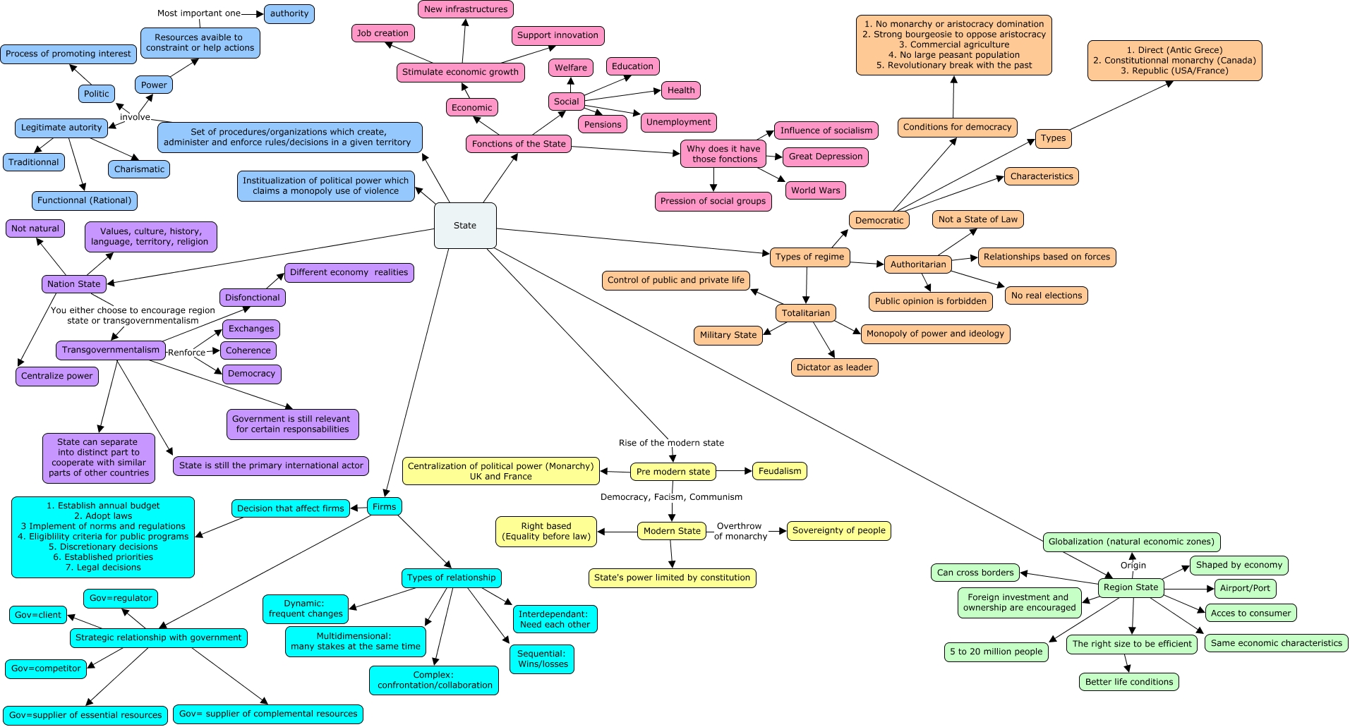 Cette carte de concepts créée avec IHMC CmapTools traite de: Séance 5, Legitimate autority ???? Functionnal (Rational), Strategic relationship with government ???? Gov=competitor, Strategic relationship with government ???? Gov= supplier of complemental resources, Modern State ???? Right based (Equality before law), Firms ???? Decision that affect firms, Economic ???? Stimulate economic growth, Region State ???? Same economic characteristics, Democratic ???? Conditions for democracy, Region State Origin Globalization (natural economic zones), State ???? Institualization of political power which claims a monopoly use of violence, Democratic ???? Characteristics, State ???? Fonctions of the State, State ???? Types of regime, Social ???? Pensions, Social ???? Health, Pre modern state ???? Feudalism, Totalitarian ???? Control of public and private life, Types of relationship ???? Interdependant: Need each other, Firms ???? Strategic relationship with government, Region State ???? Foreign investment and ownership are encouraged