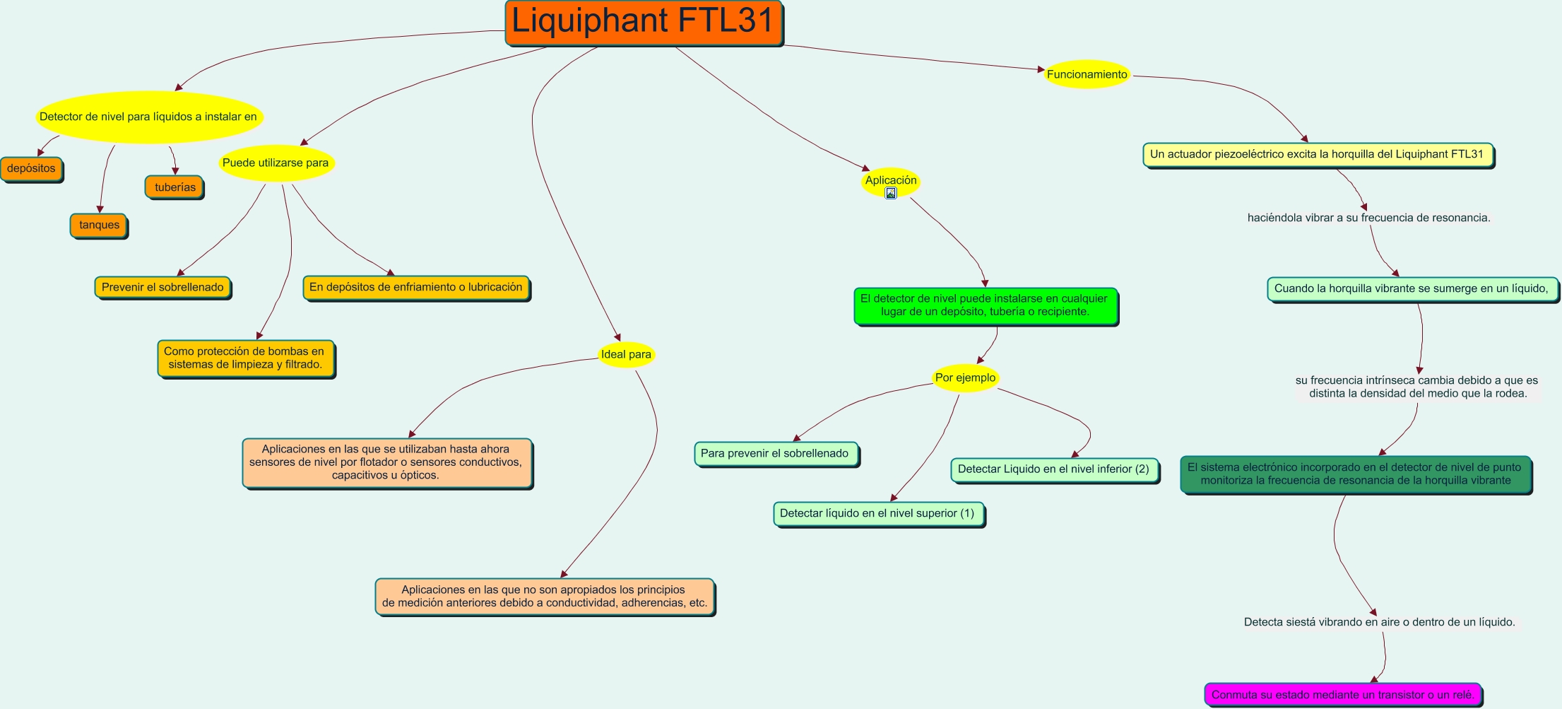 Este Cmap, tiene información relacionada con: Liquiphant FTL31, Un actuador piezoeléctrico excita la horquilla del Liquiphant FTL31 haciéndola vibrar a su frecuencia de resonancia. Cuando la horquilla vibrante se sumerge en un líquido,, Liquiphant FTL31 Ideal para Aplicaciones en las que no son apropiados los principios de medición anteriores debido a conductividad, adherencias, etc., Liquiphant FTL31 Ideal para Aplicaciones en las que se utilizaban hasta ahora sensores de nivel por flotador o sensores conductivos, capacitivos u ópticos., Liquiphant FTL31 Puede utilizarse para En depósitos de enfriamiento o lubricación, Liquiphant FTL31 Funcionamiento Un actuador piezoeléctrico excita la horquilla del Liquiphant FTL31, El detector de nivel puede instalarse en cualquier lugar de un depósito, tubería o recipiente. Por ejemplo Para prevenir el sobrellenado, El detector de nivel puede instalarse en cualquier lugar de un depósito, tubería o recipiente. Por ejemplo Detectar Liquido en el nivel inferior (2), Liquiphant FTL31 Puede utilizarse para Como protección de bombas en sistemas de limpieza y filtrado., El detector de nivel puede instalarse en cualquier lugar de un depósito, tubería o recipiente. Por ejemplo Detectar líquido en el nivel superior (1), Liquiphant FTL31 Detector de nivel para líquidos a instalar en depósitos, Cuando la horquilla vibrante se sumerge en un líquido, su frecuencia intrínseca cambia debido a que es distinta la densidad del medio que la rodea. El sistema electrónico incorporado en el detector de nivel de punto monitoriza la frecuencia de resonancia de la horquilla vibrante, Liquiphant FTL31 Detector de nivel para líquidos a instalar en tanques, Liquiphant FTL31 Detector de nivel para líquidos a instalar en tuberías, El sistema electrónico incorporado en el detector de nivel de punto monitoriza la frecuencia de resonancia de la horquilla vibrante Detecta siestá vibrando en aire o dentro de un líquido. Conmuta su estado mediante un transistor o un relé., Liquiphant FTL31 Aplicación El detector de nivel puede instalarse en cualquier lugar de un depósito, tubería o recipiente., Liquiphant FTL31 Puede utilizarse para Prevenir el sobrellenado