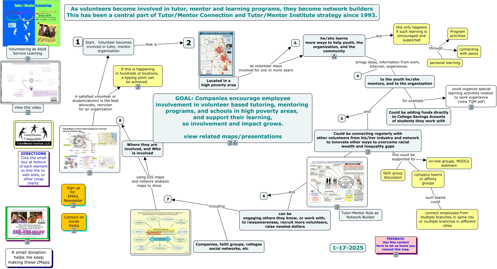 This Concept Map, created with IHMC CmapTools, has information related to: volunteer involvement strategy, can be engaging others they know, or work with, to raiseawareness, recruit more volunteers, raise needed dollars including Companies, faith groups, colleges social networks, etc, he/she learns more ways to help youth, the organization, and the community brings ideas, information from work, Internet, experiences to the youth he/she mentors, and to the organization, can be engaging others they know, or work with, to raiseawareness, recruit more volunteers, raise needed dollars including 7, Located in a high poverty area as volunteer stays involved for one or more years 3., he/she learns more ways to help youth, the organization, and the community but this only happens if such learning is encouraged and supported, company teams or affinity groups such teams could connect employees from multiple branches in same city or multiple branches in different cities, to the youth he/she mentors, and to the organization for example could organize special learning activities related to work experience (view TQM pdf), this only happens if such learning is encouraged and supported through personal learning, using GIS maps and network analysis maps to show 8, Could be connecting regularly with other volunteers from his/her industry and network to innovate other ways to overcome racial wealth and inequality gaps and 6, using GIS maps and network analysis maps to show Where they are involved, and Who is involved, this only happens if such learning is encouraged and supported through connecting with peers, this only happens if such learning is encouraged and supported through Program activities, Could be connecting regularly with other volunteers from his/her industry and network to innovate other ways to overcome racial wealth and inequality gaps and can be engaging others they know, or work with, to raiseawareness, recruit more volunteers, raise needed dollars, Start. Volunteer becomes involved in tutor, mentor organization that is 2, Could be connecting regularly with other volunteers from his/her industry and network to innovate other ways to overcome racial wealth and inequality gaps this could be supported by company teams or affinity groups, to the youth he/she mentors, and to the organization and 5, Located in a high poverty area as volunteer stays involved for one or more years he/she learns more ways to help youth, the organization, and the community, A satisfied volunteer or student/alumni is the best advocate, recruiter for an organization If this is happening in hundreds of locations, a tipping point can be achieved., he/she learns more ways to help youth, the organization, and the community brings ideas, information from work, Internet, experiences 4