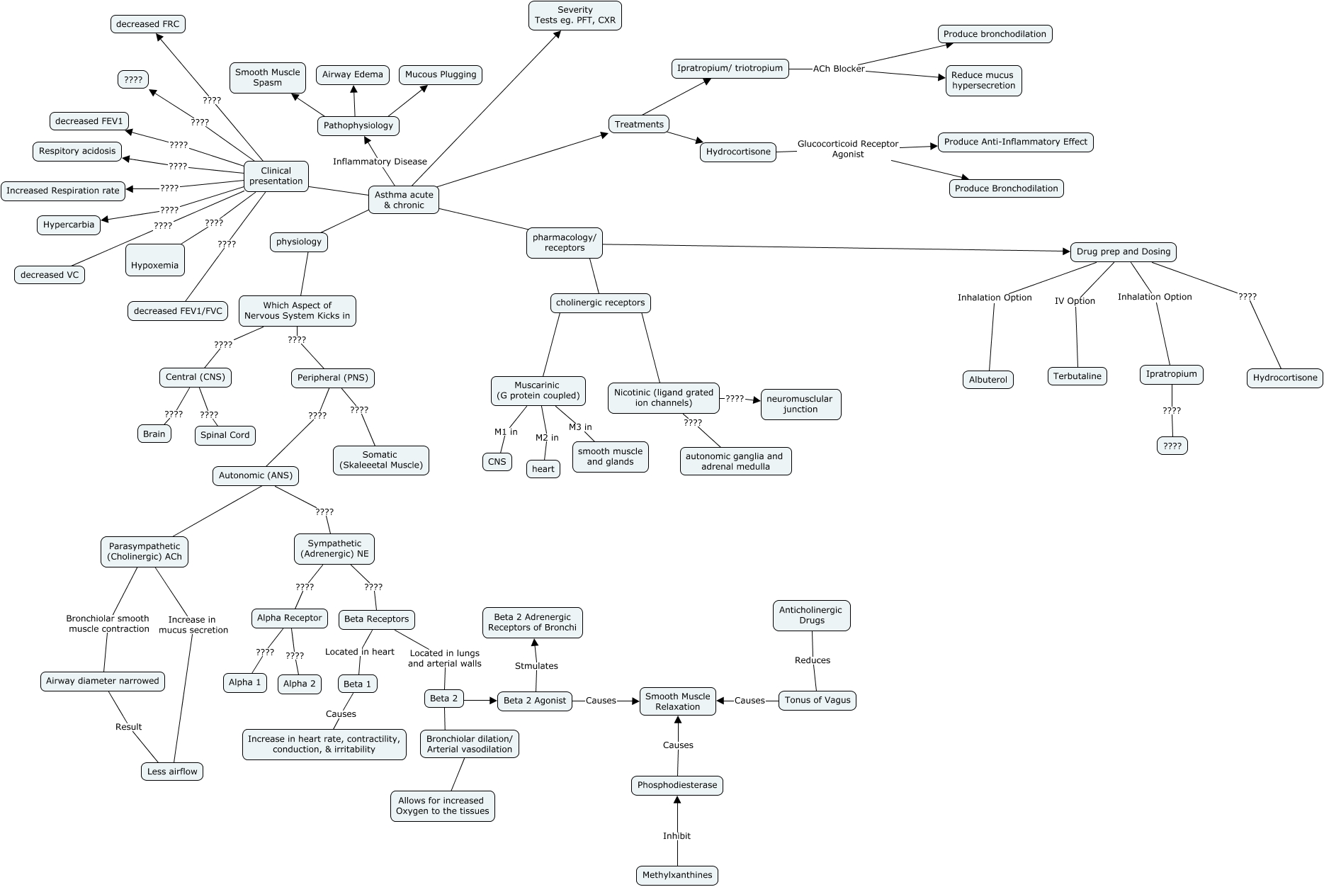 This Concept Map, created with IHMC CmapTools, has information related to: BIG ASS CMAP, Ipratropium ???? ????, Asthma acute & chronic ???? physiology, Drug prep and Dosing Inhalation Option Albuterol, Asthma acute & chronic ???? Severity Tests eg. PFT, CXR, Ipratropium/ triotropium ACh Blocker Produce bronchodilation, Hydrocortisone Glucocorticoid Receptor Agonist Produce Bronchodilation, Beta Receptors Located in lungs and arterial walls Beta 2, Parasympathetic (Cholinergic) ACh Bronchiolar smooth muscle contraction Airway diameter narrowed, Nicotinic (ligand grated ion channels) ???? autonomic ganglia and adrenal medulla, Clinical presentation ???? decreased FEV1, Asthma acute & chronic Inflammatory Disease Pathophysiology, Beta 1 Causes Increase in heart rate, contractility, conduction, & irritability, Which Aspect of Nervous System Kicks in ???? Peripheral (PNS), Beta 2 Agonist Stmulates Beta 2 Adrenergic Receptors of Bronchi, Asthma acute & chronic ???? Treatments, Hydrocortisone Glucocorticoid Receptor Agonist Produce Anti-Inflammatory Effect, pharmacology/ receptors ???? cholinergic receptors, Clinical presentation ???? decreased VC, Anticholinergic Drugs Reduces Tonus of Vagus, Muscarinic (G protein coupled) M3 in smooth muscle and glands