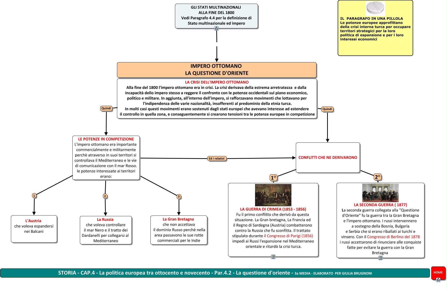 Questa Cmap, creata con IHMC CmapTools, contiene informazioni relative a: STORIA - Par.4.2 - La questione d'oriente - GB 3a media, CONFLITTI CHE NE DERIVARONO 2° LA SECONDA GUERRA ( 1877) La seconda guerra collegata alla "Questione d'Oriente" fu la guerra tra la Gran Bretagna e l'impero ottomano. I russi intervennero a sostegno della Bosnia, Bulgaria e Serbia che si erano riballati ai turchi e vinsero. Con il Congresso di Berlino del 1878 i russi accettarono di rinunciare alle conquiste fatte per evitare la guerra con la Gran Bretagna, CONFLITTI CHE NE DERIVARONO 1° LA GUERRA DI CRIMEA (1853 - 1856) Fu il primo conflitto che derivò da questa situazione. La Gran bretagna, La Francia ed il Regno di Sardegna (Austria) combatterono contro la Russia che fu sconfitta. Il trattato stipulato durante il Congresso di Parigi (1856) impedì ai Russi l'espansione nel Mediterraneo orientale e ritardò la crisi turca., LA CRISI DELL'IMPERO OTTOMANO Alla fine del 1800 l'impero ottomano era in crisi. La crisi derivava della estrema arretratezza e dalla incapacità dello impero stesso a reggere il confronto con le potenze occidentali sul piano economico, politico e militare. In aggiunta, all'interno dell'impero, si rafforzavano movimenti che lottavano per l'indipendenza delle varie nazionalità, insofferenti al predominio della etnia turca. In molti casi questi movimenti erano sostenuti dagli stati europei che avevano interesse ad estendere il controllo in quella zona, e conseguentemente si crearono tensioni tra le potenze europee in competizione Quindi CONFLITTI CHE NE DERIVARONO, LA CRISI DELL'IMPERO OTTOMANO Alla fine del 1800 l'impero ottomano era in crisi. La crisi derivava della estrema arretratezza e dalla incapacità dello impero stesso a reggere il confronto con le potenze occidentali sul piano economico, politico e militare. In aggiunta, all'interno dell'impero, si rafforzavano movimenti che lottavano per l'indipendenza delle varie nazionalità, insofferenti al predominio della etnia turca. In molti casi questi movimenti erano sostenuti dagli stati europei che avevano interesse ad estendere il controllo in quella zona, e conseguentemente si crearono tensioni tra le potenze europee in competizione Quindi LE POTENZE IN COMPETIZIONE L'impero ottomano era importante commercialmente e militarmente perchè atraverso in suoi territori si controllava il Mediterraneo e le vie di comunicazione con il mar Rosso. le potenze interessate ai territori erano:, LE POTENZE IN COMPETIZIONE L'impero ottomano era importante commercialmente e militarmente perchè atraverso in suoi territori si controllava il Mediterraneo e le vie di comunicazione con il mar Rosso. le potenze interessate ai territori erano: Ed i relativi CONFLITTI CHE NE DERIVARONO, GLI STATI MULTINAZIONALI ALLA FINE DEL 1800 Vedi Paragrafo 4.4 per la definizione di Stato multinazionale ed impero IMPERO OTTOMANO LA QUESTIONE D'ORIENTE, LE POTENZE IN COMPETIZIONE L'impero ottomano era importante commercialmente e militarmente perchè atraverso in suoi territori si controllava il Mediterraneo e le vie di comunicazione con il mar Rosso. le potenze interessate ai territori erano: 1 L'Austria che voleva espandersi nei Balcani, LE POTENZE IN COMPETIZIONE L'impero ottomano era importante commercialmente e militarmente perchè atraverso in suoi territori si controllava il Mediterraneo e le vie di comunicazione con il mar Rosso. le potenze interessate ai territori erano: 3 La Gran Bretagna che non accettava il dominio Russo perchè nella area passavono le sue rotte commerciali per le Indie, LE POTENZE IN COMPETIZIONE L'impero ottomano era importante commercialmente e militarmente perchè atraverso in suoi territori si controllava il Mediterraneo e le vie di comunicazione con il mar Rosso. le potenze interessate ai territori erano: 2 La Russia che voleva controllare il mar Nero e il tratto dei Dardanelli per collegarsi al Mediterraneo