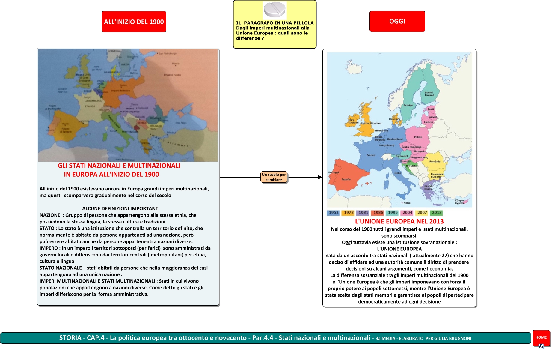 Questa Cmap, creata con IHMC CmapTools, contiene informazioni relative a: STORIA - Par.4.4 - Stati nazionali e multinazionali - GB 3a media, GLI STATI NAZIONALI E MULTINAZIONALI IN EUROPA ALL'INIZIO DEL 1900 All'inizio del 1900 esistevano ancora in Europa grandi imperi multinazionali, ma questi scomparvero gradualmente nel corso del secolo ALCUNE DEFINIZIONI IMPORTANTI NAZIONE : Gruppo di persone che appartengono alla stessa etnia, che possiedono la stessa lingua, la stessa cultura e tradizioni. STATO : Lo stato è una istituzione che controlla un territorio definito, che normalmente è abitato da persone apparteneti ad una nazione, però può essere abitato anche da persone appartenenti a nazioni diverse. IMPERO : in un impero i territori sottoposti (periferici) sono amministrati da governi locali e differiscono dai territori centrali ( metropolitani) per etnia, cultura e lingua STATO NAZIONALE : stati abitati da persone che nella maggioranza dei casi appartengono ad una unica nazione . IMPERI MULTINAZIONALI E STATI MULTINAZIONALI : Stati in cui vivono popolazioni che appartengono a nazioni diverse. Come detto gli stati e gli imperi differiscono per la forma amministrativa. Un secolo per cambiare L'UNIONE EUROPEA NEL 2013 Nel corso del 1900 tutti i grandi imperi e stati multinazionali. sono scomparsi Oggi tuttavia esiste una istituzione sovranazionale : L'UNIONE EUROPEA nata da un accordo tra stati nazionali ( attualmente 27) che hanno deciso di affidare ad una autorità comune il diritto di prendere decisioni su alcuni argomenti, come l'economia. La differenza sostanziale tra gli imperi multinazionali del 1900 e l'Unione Europea è che gli imperi imponevano con forza il proprio potere ai popoli sottomessi, mentre l'Unione Europea è stata scelta dagli stati membri e garantisce ai popoli di partecipare democraticamente ad ogni decisione