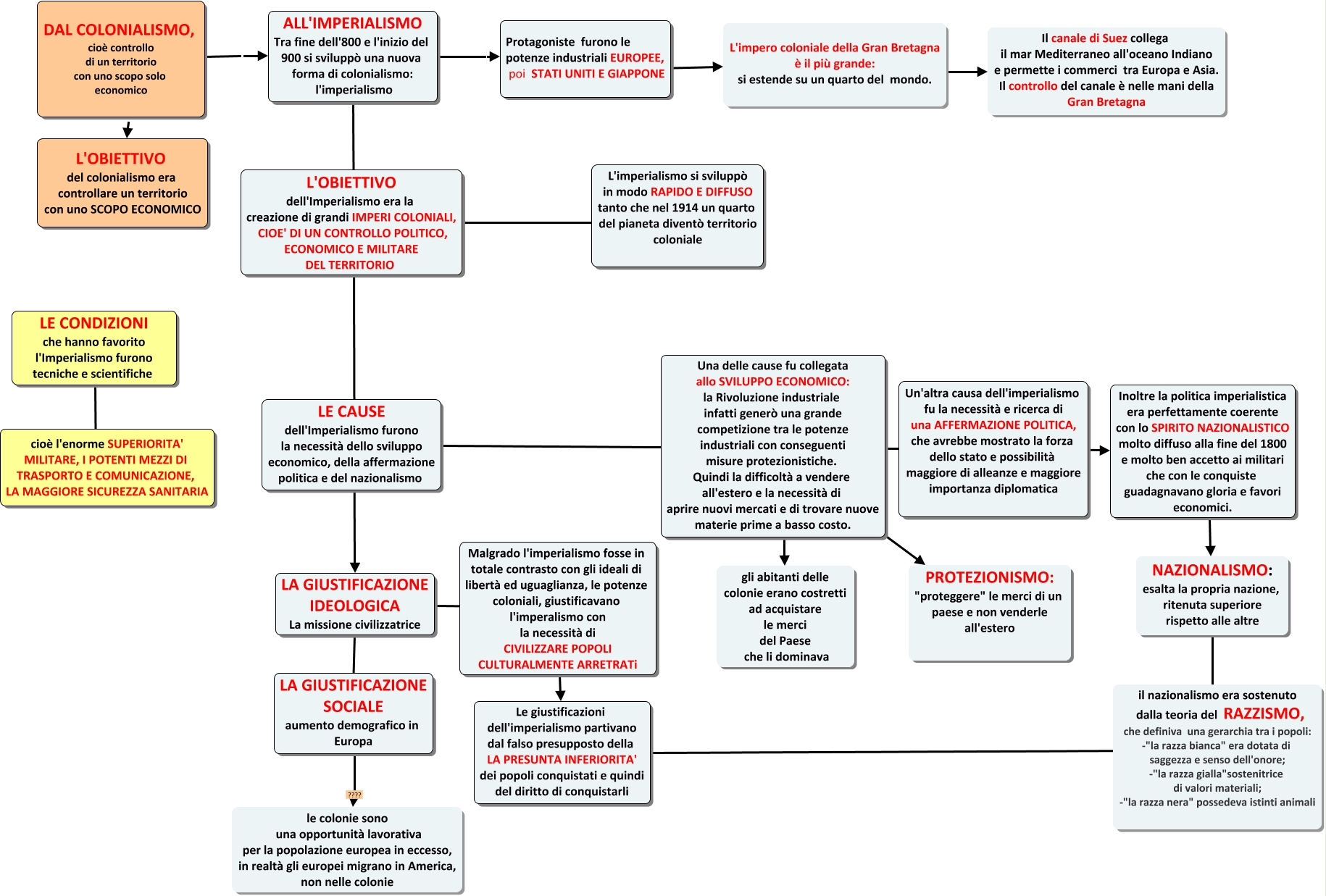 Questa Cmap, creata con IHMC CmapTools, contiene informazioni relative a: Storia - Par.2.1 - Un nuovo sviluppo coloniale - Par2.2 - Le cause dell'imperialismo - GB 3a media, L'impero coloniale della Gran Bretagna è il più grande: si estende su un quarto del mondo. ???? Il canale di Suez collega il mar Mediterraneo all'oceano Indiano e permette i commerci tra Europa e Asia. Il controllo del canale è nelle mani della Gran Bretagna, Una delle cause fu collegata allo SVILUPPO ECONOMICO: la Rivoluzione industriale infatti generò una grande competizione tra le potenze industriali con conseguenti misure protezionistiche. Quindi la difficoltà a vendere all'estero e la necessità di aprire nuovi mercati e di trovare nuove materie prime a basso costo. ???? gli abitanti delle colonie erano costretti ad acquistare le merci del Paese che li dominava, LE CONDIZIONI che hanno favorito l'Imperialismo furono tecniche e scientifiche ???? cioè l'enorme SUPERIORITA' MILITARE, I POTENTI MEZZI DI TRASPORTO E COMUNICAZIONE, LA MAGGIORE SICUREZZA SANITARIA, ALL'IMPERIALISMO Tra fine dell'800 e l'inizio del 900 si sviluppò una nuova forma di colonialismo: l'imperialismo ???? LA GIUSTIFICAZIONE IDEOLOGICA La missione civilizzatrice, L'OBIETTIVO dell'Imperialismo era la creazione di grandi IMPERI COLONIALI, CIOE' DI UN CONTROLLO POLITICO, ECONOMICO E MILITARE DEL TERRITORIO ???? L'imperialismo si sviluppò in modo RAPIDO E DIFFUSO tanto che nel 1914 un quarto del pianeta diventò territorio coloniale, LA GIUSTIFICAZIONE IDEOLOGICA La missione civilizzatrice ???? Le giustificazioni dell'imperialismo partivano dal falso presupposto della LA PRESUNTA INFERIORITA' dei popoli conquistati e quindi del diritto di conquistarli, Le giustificazioni dell'imperialismo partivano dal falso presupposto della LA PRESUNTA INFERIORITA' dei popoli conquistati e quindi del diritto di conquistarli ???? il nazionalismo era sostenuto dalla teoria del RAZZISMO, che definiva una gerarchia tra i popoli: -"la razza bianca" era dotata di saggezza e senso dell'onore; -"la razza gialla"sostenitrice di valori materiali; -"la razza nera" possedeva istinti animali, Protagoniste furono le potenze industriali EUROPEE, poi STATI UNITI E GIAPPONE ???? L'impero coloniale della Gran Bretagna è il più grande: si estende su un quarto del mondo., Inoltre la politica imperialistica era perfettamente coerente con lo SPIRITO NAZIONALISTICO molto diffuso alla fine del 1800 e molto ben accetto ai militari che con le conquiste guadagnavano gloria e favori economici. ???? NAZIONALISMO: esalta la propria nazione, ritenuta superiore rispetto alle altre, Una delle cause fu collegata allo SVILUPPO ECONOMICO: la Rivoluzione industriale infatti generò una grande competizione tra le potenze industriali con conseguenti misure protezionistiche. Quindi la difficoltà a vendere all'estero e la necessità di aprire nuovi mercati e di trovare nuove materie prime a basso costo. ???? PROTEZIONISMO: "proteggere" le merci di un paese e non venderle all'estero, DAL COLONIALISMO, cioè controllo di un territorio con uno scopo solo economico L'OBIETTIVO del colonialismo era controllare un territorio con uno SCOPO ECONOMICO, NAZIONALISMO: esalta la propria nazione, ritenuta superiore rispetto alle altre ???? il nazionalismo era sostenuto dalla teoria del RAZZISMO, che definiva una gerarchia tra i popoli: -"la razza bianca" era dotata di saggezza e senso dell'onore; -"la razza gialla"sostenitrice di valori materiali; -"la razza nera" possedeva istinti animali, LE CAUSE dell'Imperialismo furono la necessità dello sviluppo economico, della affermazione politica e del nazionalismo ???? Inoltre la politica imperialistica era perfettamente coerente con lo SPIRITO NAZIONALISTICO molto diffuso alla fine del 1800 e molto ben accetto ai militari che con le conquiste guadagnavano gloria e favori economici., ALL'IMPERIALISMO Tra fine dell'800 e l'inizio del 900 si sviluppò una nuova forma di colonialismo: l'imperialismo Protagoniste furono le potenze industriali EUROPEE, poi STATI UNITI E GIAPPONE, LA GIUSTIFICAZIONE SOCIALE aumento demografico in Europa ???? le colonie sono una opportunità lavorativa per la popolazione europea in eccesso, in realtà gli europei migrano in America, non nelle colonie, LA GIUSTIFICAZIONE IDEOLOGICA La missione civilizzatrice ???? LA GIUSTIFICAZIONE SOCIALE aumento demografico in Europa, DAL COLONIALISMO, cioè controllo di un territorio con uno scopo solo economico ALL'IMPERIALISMO Tra fine dell'800 e l'inizio del 900 si sviluppò una nuova forma di colonialismo: l'imperialismo