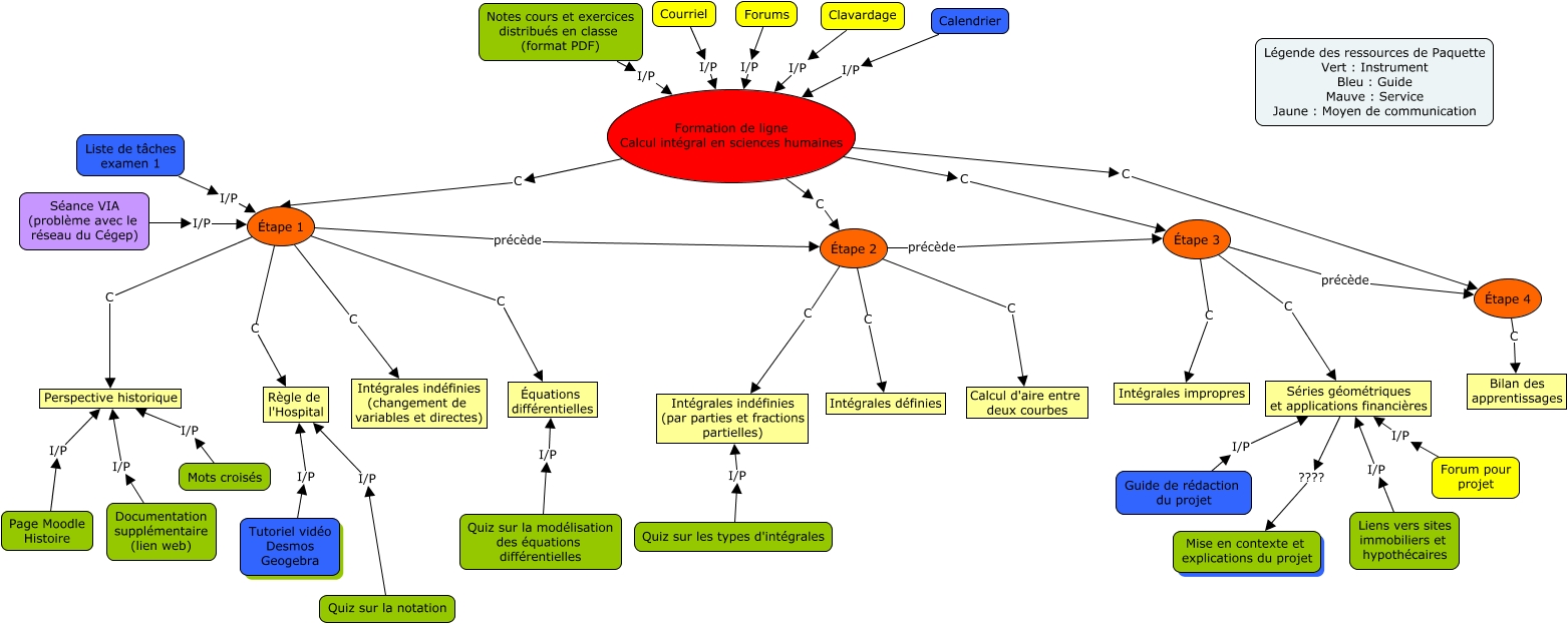 This Concept Map, created with IHMC CmapTools, has information related to: Schéma formation, Étape 1 C Intégrales indéfinies (changement de variables et directes), Page Moodle Histoire I/P Perspective historique, Étape 2 C Intégrales indéfinies (par parties et fractions partielles), Forum pour projet I/P Séries géométriques et applications financières, Courriel I/P Formation de ligne Calcul intégral en sciences humaines, Étape 2 précède Étape 3, Étape 2 C Calcul d'aire entre deux courbes, Étape 3 précède Étape 4, Notes cours et exercices distribués en classe (format PDF) I/P Formation de ligne Calcul intégral en sciences humaines, Tutoriel vidéo Desmos Geogebra I/P Règle de l'Hospital, Étape 3 C Intégrales impropres, Calendrier I/P Formation de ligne Calcul intégral en sciences humaines, Étape 1 C Perspective historique, Étape 2 C Intégrales définies, Étape 1 C Équations différentielles, Formation de ligne Calcul intégral en sciences humaines C Étape 4, Formation de ligne Calcul intégral en sciences humaines C Étape 2, Quiz sur la modélisation des équations différentielles I/P Équations différentielles, Liens vers sites immobiliers et hypothécaires I/P Séries géométriques et applications financières, Étape 1 C Règle de l'Hospital