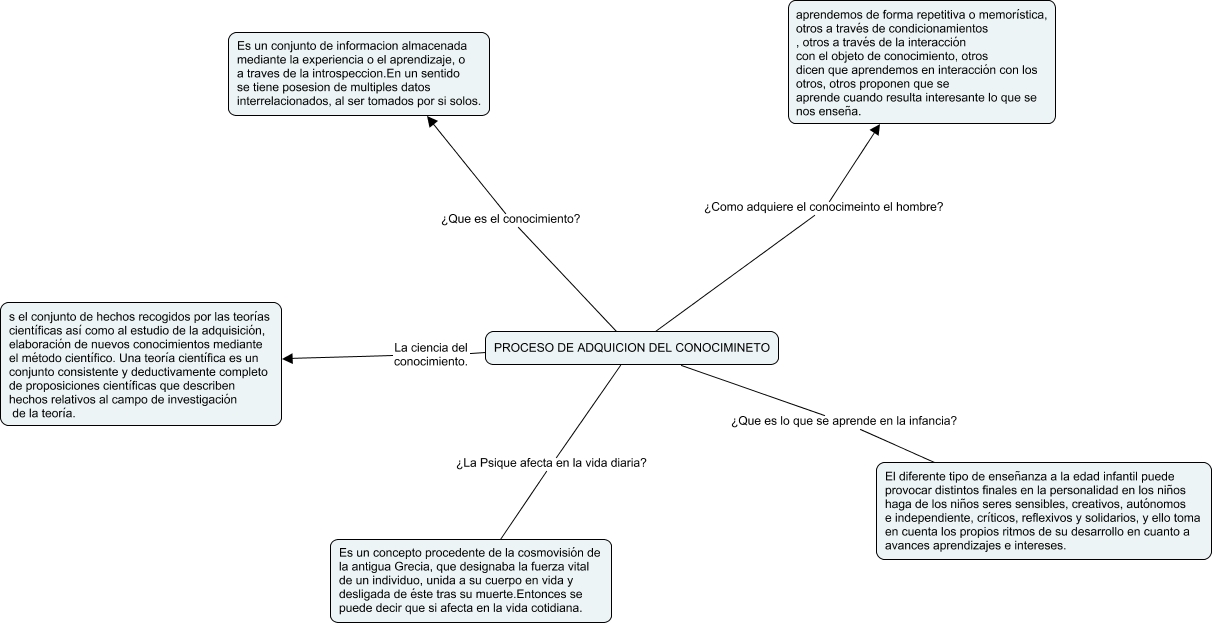 Este Cmap, tiene información relacionada con: Tarea de investigacion, PROCESO DE ADQUICION DEL CONOCIMINETO ¿Como adquiere el conocimeinto el hombre? aprendemos de forma repetitiva o memorística, otros a través de condicionamientos , otros a través de la interacción con el objeto de conocimiento, otros dicen que aprendemos en interacción con los otros, otros proponen que se aprende cuando resulta interesante lo que se nos enseña., PROCESO DE ADQUICION DEL CONOCIMINETO ¿Que es el conocimiento? Es un conjunto de informacion almacenada mediante la experiencia o el aprendizaje, o a traves de la introspeccion.En un sentido se tiene posesion de multiples datos interrelacionados, al ser tomados por si solos., PROCESO DE ADQUICION DEL CONOCIMINETO ¿La Psique afecta en la vida diaria? Es un concepto procedente de la cosmovisión de la antigua Grecia, que designaba la fuerza vital de un individuo, unida a su cuerpo en vida y desligada de éste tras su muerte.Entonces se puede decir que si afecta en la vida cotidiana., PROCESO DE ADQUICION DEL CONOCIMINETO ¿Que es lo que se aprende en la infancia? El diferente tipo de enseñanza a la edad infantil puede provocar distintos finales en la personalidad en los niños haga de los niños seres sensibles, creativos, autónomos e independiente, críticos, reflexivos y solidarios, y ello toma en cuenta los propios ritmos de su desarrollo en cuanto a avances aprendizajes e intereses., PROCESO DE ADQUICION DEL CONOCIMINETO La ciencia del conocimiento. s el conjunto de hechos recogidos por las teorías científicas así como al estudio de la adquisición, elaboración de nuevos conocimientos mediante el método científico. Una teoría científica es un conjunto consistente y deductivamente completo de proposiciones científicas que describen hechos relativos al campo de investigación de la teoría.