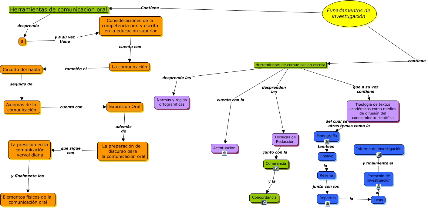 Este Cmap, tiene información relacionada con: Unidad02, Expresion Oral además de La preparación del discurso para la comunicación oral, s y a su vez tiene Consideraciones de la competencia oral y escrita en la educacion superior, Funadamentos de investugación contiene Herramientas de comunicacion escrita, La presicion en la comunicación verval diaria y finalmente los Elementos fisicos de la comunicación oral, Herramientas de comunicacion escrita desprenden las Tecnicas de Redacción, Monografía también Ensayo, La comunicación también el Circuito del habla, Consideraciones de la competencia oral y escrita en la educacion superior cuenta con La comunicación, Protocolo de investigación y finalmente el Informe de investigación, Funadamentos de investugación Contiene Herramientas de comunicacion oral, Herramientas de comunicacion escrita desprende las Normas y reglas ortogramficas, Reportes la Tesis, Tesis el Protocolo de investigación, Coherencia y la Concordancia, Tecnicas de Redacción junto con la Coherencia, Tipologia de textos académicos como medios de difusión del conocimiento científico del cual se desprenden otros temas como la Monografía, Reseña junto con los Reportes, Herramientas de comunicacion escrita cuenta con la Acentuacion, Herramientas de comunicacion escrita que a su vez contiene Tipologia de textos académicos como medios de difusión del conocimiento científico, Circuito del habla seguido de Axiomas de la comunicación