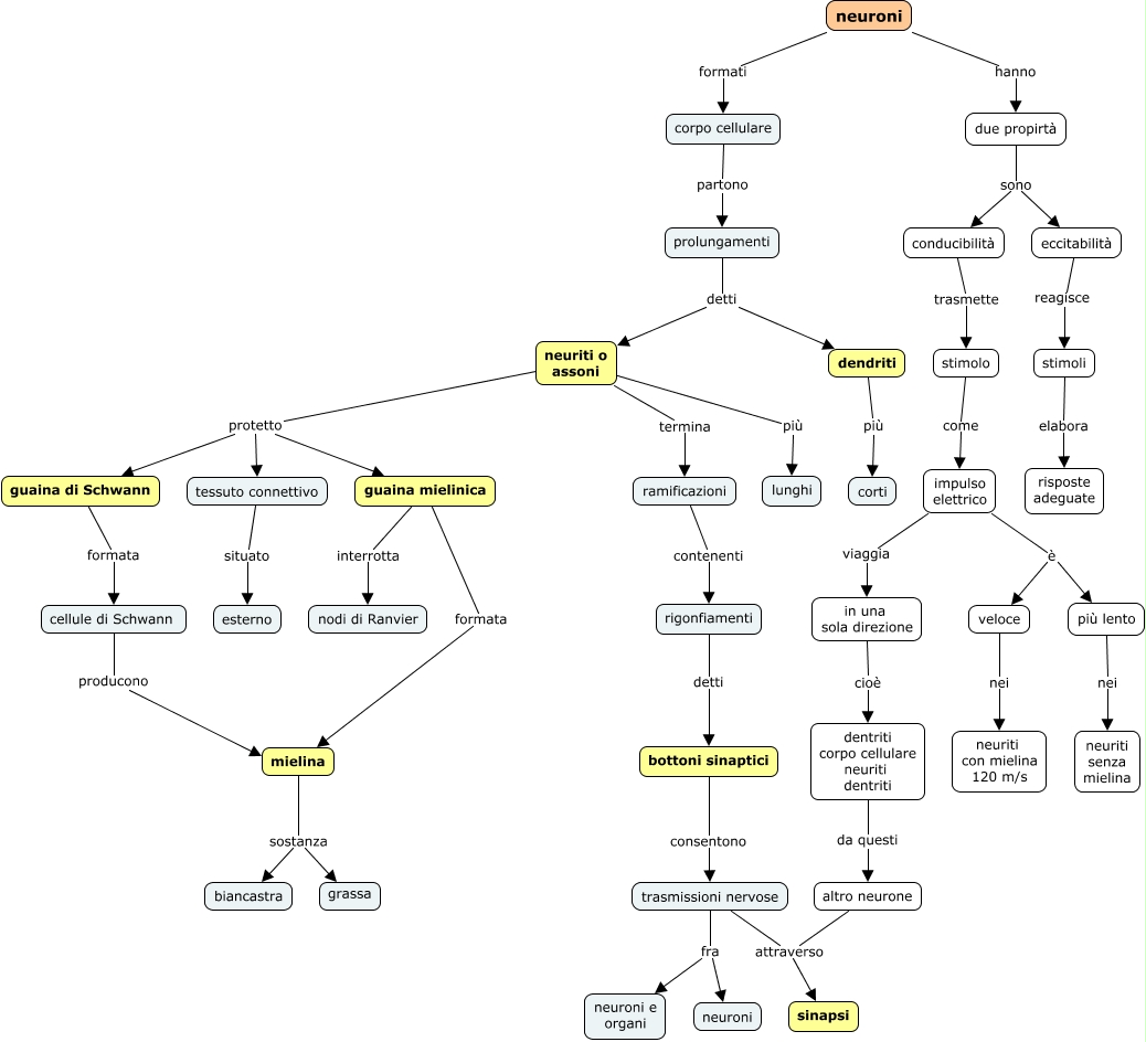 Questa Cmap, creata con IHMC CmapTools, contiene informazioni relative a: 03 neuroni, impulso elettrico è veloce, in una sola direzione cioè dentriti corpo cellulare neuriti dentriti, neuroni hanno due propirtà, dentriti corpo cellulare neuriti dentriti da questi altro neurone, stimoli elabora risposte adeguate, guaina di Schwann formata cellule di Schwann, dendriti più corti, rigonfiamenti detti bottoni sinaptici, tessuto connettivo situato esterno, trasmissioni nervose fra neuroni, neuriti o assoni più lunghi, più lento nei neuriti senza mielina, neuriti o assoni protetto tessuto connettivo, corpo cellulare partono prolungamenti, guaina mielinica interrotta nodi di Ranvier, impulso elettrico viaggia in una sola direzione, guaina mielinica formata mielina, mielina sostanza biancastra, neuriti o assoni protetto guaina di Schwann, due propirtà sono conducibilità