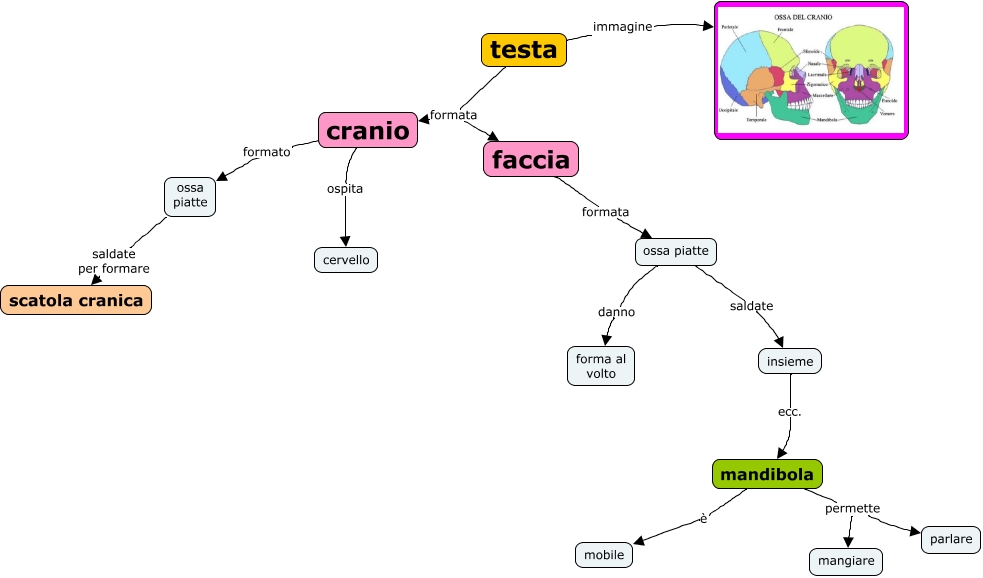 Questa Cmap, creata con IHMC CmapTools, contiene informazioni relative a: 12.6.1 cranio, ossa piatte danno forma al volto, insieme ecc. mandibola, testa formata faccia, mandibola permette parlare, faccia formata ossa piatte, mandibola permette mangiare, mandibola è mobile, ossa piatte saldate per formare scatola cranica, cranio ospita cervello, cranio formato ossa piatte, ossa piatte saldate insieme, testa immagine, testa formata cranio