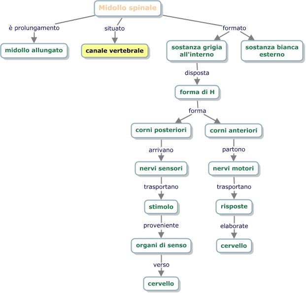 Questa Cmap, creata con IHMC CmapTools, contiene informazioni relative a: 11 midollo spinale, nervi sensori trasportano stimolo, Midollo spinale formato sostanza bianca esterno, corni posteriori arrivano nervi sensori, nervi motori trasportano risposte, organi di senso verso cervello, Midollo spinale formato sostanza grigia all'interno, sostanza grigia all'interno disposta forma di H, forma di H forma corni anteriori, Midollo spinale è prolungamento midollo allungato, stimolo proveniente organi di senso, Midollo spinale situato canale vertebrale, corni anteriori partono nervi motori, forma di H forma corni posteriori, risposte elaborate cervello