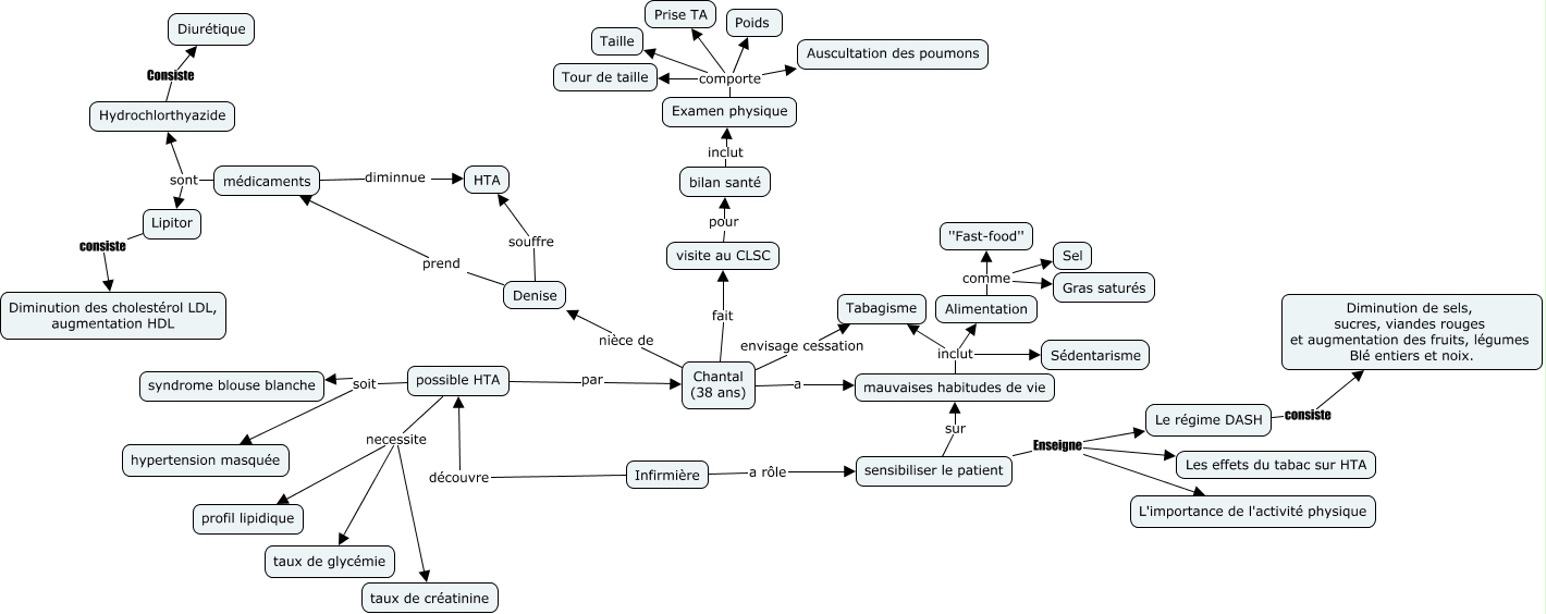 Cette carte de concepts créée avec IHMC CmapTools traite de: HYPERTENSION, possible HTA necessite taux de glycémie, possible HTA necessite profil lipidique, possible HTA soit syndrome blouse blanche, sensibiliser le patient Enseigne Le régime DASH, Alimentation comme Sel, mauvaises habitudes de vie inclut Sédentarisme, Alimentation comme Gras saturés, Chantal (38 ans) a mauvaises habitudes de vie, Examen physique comporte Auscultation des poumons, Examen physique comporte Prise TA, Denise prend médicaments, médicaments sont Lipitor, possible HTA par Chantal (38 ans), Lipitor consiste Diminution des cholestérol LDL, augmentation HDL, Alimentation comme ''Fast-food'', Denise souffre HTA, sensibiliser le patient Enseigne Les effets du tabac sur HTA, Chantal (38 ans) nièce de Denise, Infirmière découvre possible HTA, Hydrochlorthyazide Consiste Diurétique