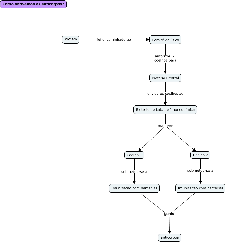 Esse mapa conceitual, produzido no IHMC CmapTools, tem a informação relacionada a: Mapa obtenção de anticorpos, Biotério do Lab. de Imunoquímica manteve Coelho 1, Biotério do Lab. de Imunoquímica manteve Coelho 2, Projeto foi encaminhado ao Comitê de Ética, Imunização com hemácias gerou anticorpos, Coelho 1 submeteu-se a Imunização com hemácias, Comitê de Ética autorizou 2 coelhos para Biotério Central, Biotério Central enviou os coelhos ao Biotério do Lab. de Imunoquímica, Coelho 2 submeteu-se a Imunização com bactérias, Imunização com bactérias gerou anticorpos