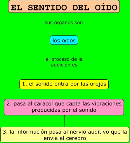 Este Cmap, tiene información relacionada con: El sentido del oído, EL SENTIDO DEL OÍDO sus órganos son los oídos, 2. pasa al caracol que capta las vibraciones producidas por el sonido 3. la información pasa al nervio auditivo que la envía al cerebro, los oídos el proceso de la audición es 1. el sonido entra por las orejas, 1. el sonido entra por las orejas 2. pasa al caracol que capta las vibraciones producidas por el sonido