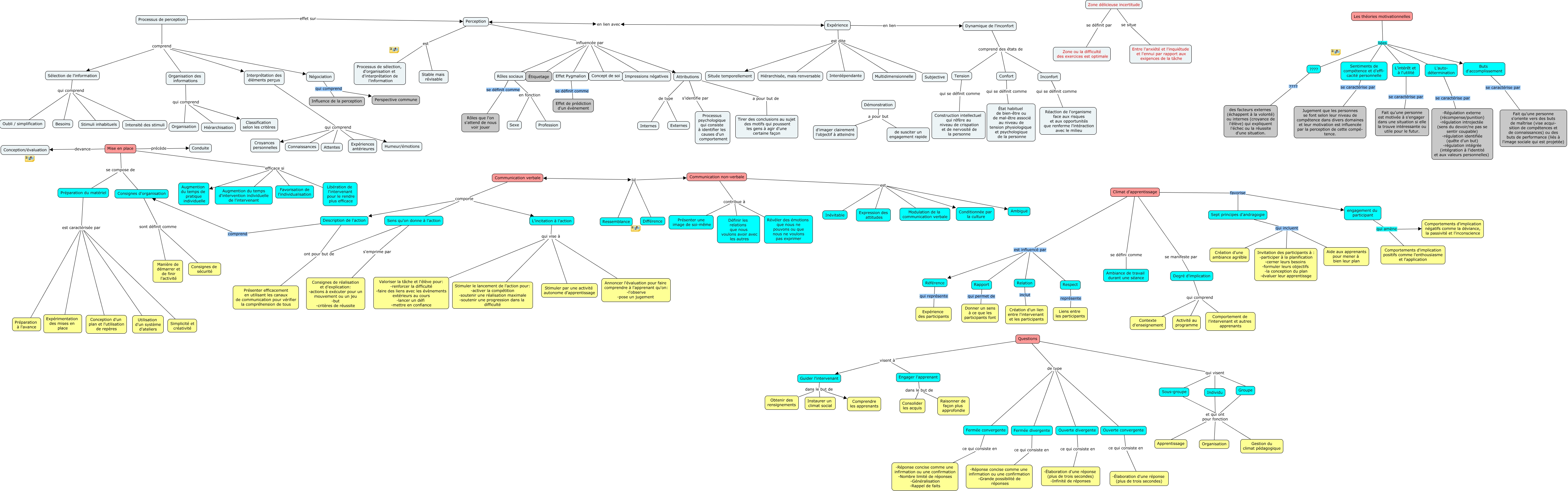 Cette carte de concepts créée avec IHMC CmapTools traite de: Schématisation intervention, Les théories motivationnelles liées L'auto- détermination, Communication non-verbale contribue à Révéler des émotions que nous ne pouvons ou que nous ne voulons pas exprimer, Interprétation des éléments perçus qui comprend Connaissances, Zone délicieuse incertitude se définit par Zone ou la difficulté des exercices est optimale, Expérience est dite Située temporellement, Les théories motivationnelles liées Sentiments de compétence et d'effi- cacité personnelle, Sept principes d'andragogie qui incluent Invitation des participants à : -participer à la planification -cerner leurs besoins -formuler leurs objectifs -la conception du plan -évaluer leur apprentissge, Sept principes d'andragogie qui incluent Aide aux apprenants pour mener à bien leur plan, Climat d'apprentissage est influencé par Rapport, Organisation des informations qui comprend Classification selon les critères, Interprétation des éléments perçus qui comprend Attentes, Les théories motivationnelles liées Buts d'accomplissement, Préparation du matériel est caractérisée par Conception d'un plan et l'utilisation de repères, Climat d'apprentissage favorise Sept principes d'andragogie, Individu et qui ont pour fonction Apprentissage, Mise en place se compose de Consignes d'organisation, Engager l'apprenant dans le but de Raisonner de façon plus approfondie, Sous-groupe et qui ont pour fonction Organisation, Attributions de type Internes, Buts d'accomplissement se caractérise par Fait qu'une personne s'oriente vers des buts de maîtrise (vise acqui- sition de compétences et de connaissances) ou des buts de performance (liés à l'image sociale qui est projetée)