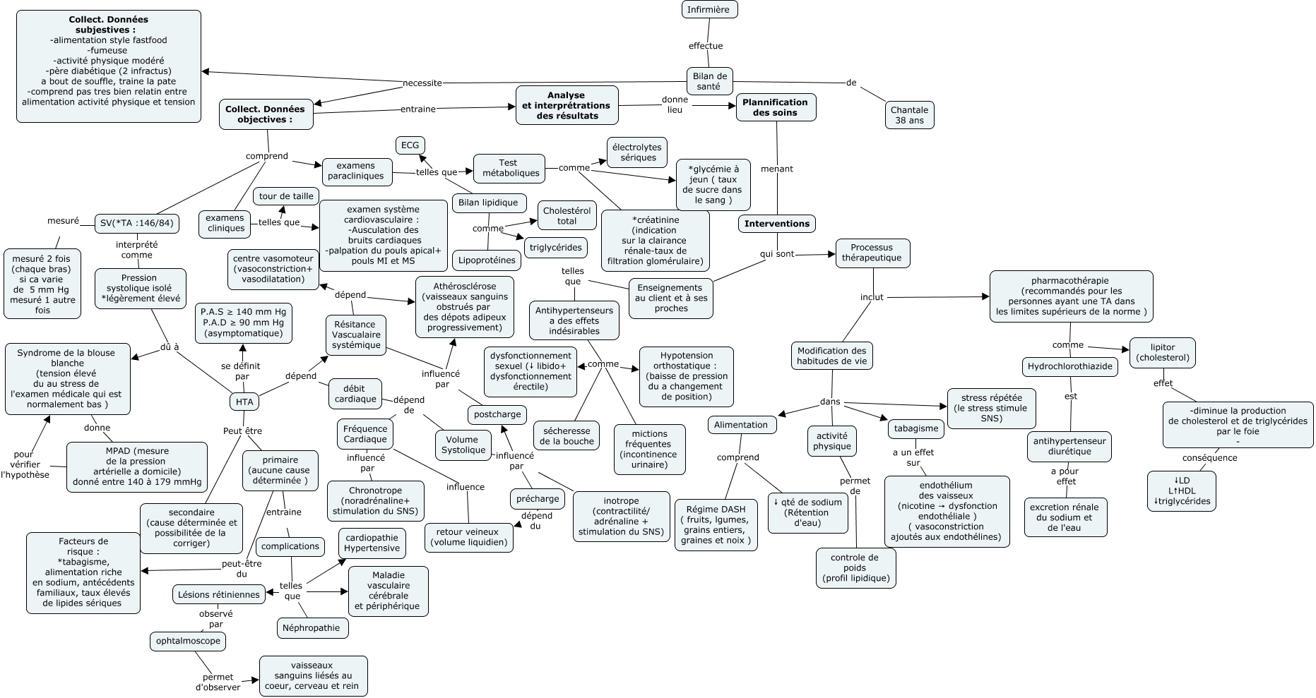 Cette carte de concepts créée avec IHMC CmapTools traite de: SIC3 REGINE, complications telles que Néphropathie, HTA Peut être secondaire (cause déterminée et possibilitée de la corriger), complications telles que Maladie vasculaire cérébrale et périphérique, primaire (aucune cause déterminée ) peut-être du Facteurs de risque : *tabagisme, alimentation riche en sodium, antécédents familiaux, taux élevés de lipides sériques, Hydrochlorothiazide est antihypertenseur diurétique, Enseignements au client et à ses proches telles que Antihypertenseurs a des effets indésirables, Alimentation comprend ↓ qté de sodium (Rétention d'eau), Antihypertenseurs a des effets indésirables comme mictions fréquentes (incontinence urinaire), Test métaboliques comme *créatinine (indication sur la clairance rénale-taux de filtration glomérulaire), examens cliniques telles que tour de taille, pharmacothérapie (recommandés pour les personnes ayant une TA dans les limites supérieurs de la norme ) comme Hydrochlorothiazide, Fréquence Cardiaque influencé par Chronotrope (noradrénaline+ stimulation du SNS), Bilan lipidique comme Lipoprotéines, examens paracliniques telles que Bilan lipidique, Pression systolique isolé *légèrement élevé dû à Syndrome de la blouse blanche (tension élevé du au stress de l'examen médicale qui est normalement bas ), Collect. Données objectives : comprend SV(*TA :146/84), SV(*TA :146/84) interprété comme Pression systolique isolé *légèrement élevé, tabagisme a un effet sur endothélium des vaisseux (nicotine → dysfonction endothéliale ) ( vasoconstriction ajoutés aux endothélines), SV(*TA :146/84) mesuré mesuré 2 fois (chaque bras) si ca varie de 5 mm Hg mesuré 1 autre fois, HTA dépend Résitance Vascualaire systémique