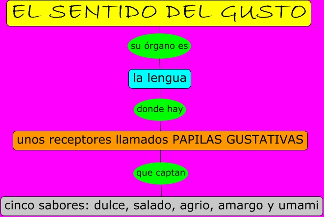 Este Cmap, tiene información relacionada con: El sentido del gusto, la lengua donde hay unos receptores llamados PAPILAS GUSTATIVAS, EL SENTIDO DEL GUSTO su órgano es la lengua, unos receptores llamados PAPILAS GUSTATIVAS que captan cinco sabores: dulce, salado, agrio, amargo y umami