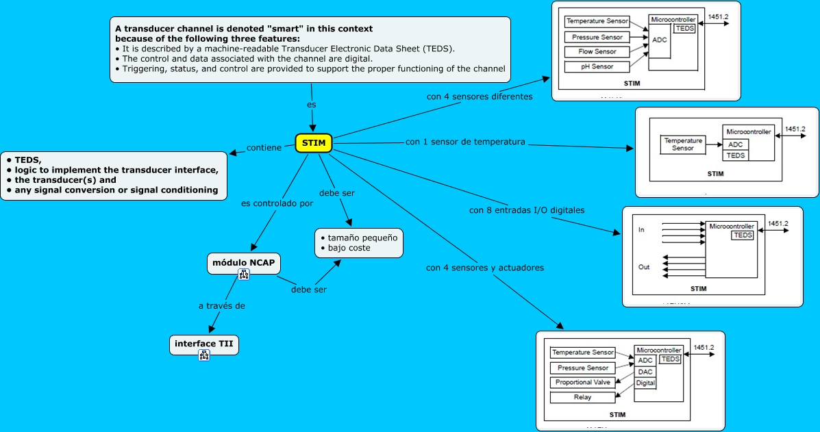 Este Cmap, tiene información relacionada con: STIM, STIM con 1 sensor de temperatura, módulo NCAP a través de interface TII, STIM contiene • TEDS, • logic to implement the transducer interface, • the transducer(s) and • any signal conversion or signal conditioning, STIM debe ser • tamaño pequeño • bajo coste, módulo NCAP debe ser • tamaño pequeño • bajo coste, STIM con 4 sensores y actuadores, STIM es controlado por módulo NCAP, STIM con 8 entradas I/O digitales, STIM con 4 sensores diferentes, A transducer channel is denoted "smart" in this context because of the following three features: • It is described by a machine-readable Transducer Electronic Data Sheet (TEDS). • The control and data associated with the channel are digital. • Triggering, status, and control are provided to support the proper functioning of the channel es STIM