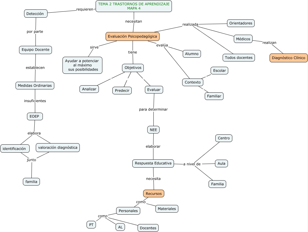 Este Cmap, tiene información relacionada con: TEMA 2 MAPA 3, Médicos realizan Diagnóstico Clínico, identificación junto familia, Evaluación Psicopedagógica realizada Orientadores, TEMA 2 TRASTORNOS DE APRENDIZAJE MAPA 4 necesitan Evaluación Psicopedagógica, Personales como PT, Evaluación Psicopedagógica realizada Médicos, Evaluación Psicopedagógica realizada Todos docentes, Medidas Ordinarias insuficientes EOEP, Recursos como Materiales, Objetivos Evaluar, NEE elaborar Respuesta Educativa, TEMA 2 TRASTORNOS DE APRENDIZAJE MAPA 4 requieren Detección, Evaluación Psicopedagógica evalúa Alumno, Contexto Escolar, Evaluación Psicopedagógica evalúa Contexto, Objetivos Analizar, Objetivos Predecir, Personales como Docentes, Evaluación Psicopedagógica sirve Ayudar a potenciar al máximo sus posibilidades, Recursos como Personales
