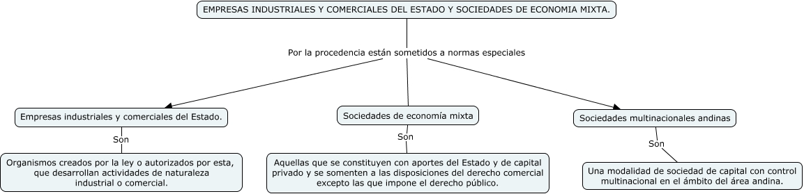 Este Cmap, tiene información relacionada con: EMPRESAS INDUSTRIALES, EMPRESAS INDUSTRIALES Y COMERCIALES DEL ESTADO Y SOCIEDADES DE ECONOMIA MIXTA. Por la procedencia están sometidos a normas especiales Empresas industriales y comerciales del Estado., Sociedades de economía mixta Son Aquellas que se constituyen con aportes del Estado y de capital privado y se somenten a las disposiciones del derecho comercial excepto las que impone el derecho público., Sociedades multinacionales andinas Son Una modalidad de sociedad de capital con control multinacional en el ámbito del área andina., EMPRESAS INDUSTRIALES Y COMERCIALES DEL ESTADO Y SOCIEDADES DE ECONOMIA MIXTA. Por la procedencia están sometidos a normas especiales Sociedades de economía mixta, Empresas industriales y comerciales del Estado. Son Organismos creados por la ley o autorizados por esta, que desarrollan actividades de naturaleza industrial o comercial., EMPRESAS INDUSTRIALES Y COMERCIALES DEL ESTADO Y SOCIEDADES DE ECONOMIA MIXTA. Por la procedencia están sometidos a normas especiales Sociedades multinacionales andinas