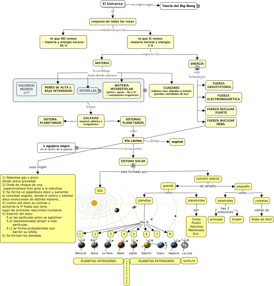 Este Cmap, tiene información relacionada con: Tema 001, δ Universo ↓ respecto a la formación del Universo, planetas hay 8 4, GALAXIAS (espiral, elíptica o irregulares) sin SISTEMA PLANETARIOS, ENERGÍA está formada por FUERZA NUCLEAR DÉBIL, ENERGÍA está formada por FUERZA GRAVITATORIA, agujeros negros es · fuerza de atracción enorme · la gravedad totalmente descontrolada, pequeño como asteroides, SISTEMA SOLAR está formado por SOL, fases de expansión y contracción del Universo ahora estamos en fase de expansión, δ Universo cte respecto a la formación del Universo, conjunto de todas las cosas entediendo por tal lo que NO vemos - materia y energía oscura- 95 %, GALAXIAS (espiral, elíptica o irregulares) con SISTEMAS PLANETARIOS, SISTEMA SOLAR está formado por cuerpos opacos, Vía Láctea se encuentra SISTEMA SOLAR, agujeros negros nacen de la muerte de una estrella, agujeros negros Δ · se ven sólo cuando captan energía · un aguejero negro alimentándose es de cualquier color menos negro · lo que el agujero negro no puede digerir lo vómita, planetas hay 8 1, MATERIA la constituye, hasta donde sabemos ESTRELLAS, asteroides hay 2 cinturones Kuiper, ENERGÍA está formada por FUERZA NUCLEAR FUERTE