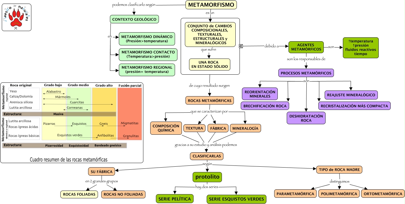 Este Cmap, tiene información relacionada con: Tema 05, SU FÁBRICA en 2 grandes grupos ROCAS NO FOLIADAS, CLASIFICARLAS según TIPO de ROCA MADRE, CLASIFICARLAS según SU FÁBRICA, TIPO de ROCA MADRE distinguimos POLIMETAMÓRFICA, CONTEXTO GEOLÓGICO en METAMORFISMO CONTACTO (Temperatura>presión), PROCESOS METAMÓRFICOS son REAJUSTE MINERALÓGICO, ROCAS METAMÓRFICAS que se caracterizan por MINERALOGÍA, protolito hay dos series SERIE PELÍTICA, ???? de cuyo resultado surgen ROCAS METAMÓRFICAS, TEXTURA gracias a su estudio y análisis podemos CLASIFICARLAS, CONTEXTO GEOLÓGICO en METAMORFISMO DINÁMICO (Presión>temperatura), CLASIFICARLAS según protolito, protolito hay dos series SERIE ESQUISTOS VERDES, CONTEXTO GEOLÓGICO en METAMORFISMO REGIONAL (presión= temperatura), PROCESOS METAMÓRFICOS son BRECHIFICACIÓN ROCA, ROCAS METAMÓRFICAS que se caracterizan por FÁBRICA, ROCAS METAMÓRFICAS que se caracterizan por COMPOSICIÓN QUÍMICA, COMPOSICIÓN QUÍMICA gracias a su estudio y análisis podemos CLASIFICARLAS, PROCESOS METAMÓRFICOS son REORIENTACIÓN MINERALES, FÁBRICA gracias a su estudio y análisis podemos CLASIFICARLAS