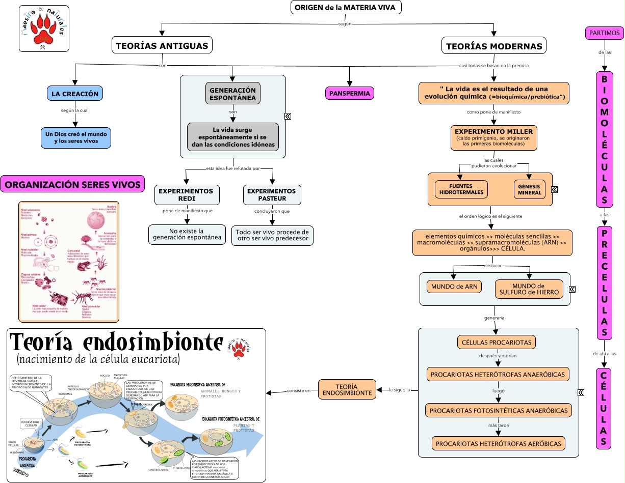 Este Cmap, tiene información relacionada con: Tema 22, EXPERIMENTO MILLER (caldo primigenio, se originaron las primeras biomoléculas) las cuales pudieron evolucionar FUENTES HIDROTERMALES, PROCARIOTAS HETERÓTROFAS ANAERÓBICAS luego PROCARIOTAS FOTOSINTÉTICAS ANAERÓBICAS, CÉLULAS PROCARIOTAS después vendrían PROCARIOTAS HETERÓTROFAS ANAERÓBICAS, ???? generaría CÉLULAS PROCARIOTAS, B I O M O L É C U L A S a las P R E C E L U L A S, TEORÍAS ANTIGUAS son GENERACIÓN ESPONTÁNEA, EXPERIMENTO MILLER (caldo primigenio, se originaron las primeras biomoléculas) las cuales pudieron evolucionar GÉNESIS MINERAL, ???? esta idea fue refutada por EXPERIMENTOS REDI, TEORÍA ENDOSIMBIONTE consiste en ????, LA CREACIÓN según la cual Un Dios creó el mundo y los seres vivos, PROCARIOTAS FOTOSINTÉTICAS ANAERÓBICAS más tarde PROCARIOTAS HETERÓTROFAS AERÓBICAS, elementos químicos >> moléculas sencillas >> macromoléculas >> supramacromoléculas (ARN) >> orgánulos>>> CÉLULA. destacar MUNDO de ARN, TEORÍAS MODERNAS casi todas se basan en la premisa " La vida es el resultado de una evolución química (=bioquímica/prebiótica"), ???? esta idea fue refutada por EXPERIMENTOS PASTEUR, ???? el orden lógico es el siguiente elementos químicos >> moléculas sencillas >> macromoléculas >> supramacromoléculas (ARN) >> orgánulos>>> CÉLULA., GENERACIÓN ESPONTÁNEA son La vida surge espontáneamente si se dan las condiciones idóneas, ORIGEN de la MATERIA VIVA según TEORÍAS ANTIGUAS, EXPERIMENTOS PASTEUR concluyeron que Todo ser vivo procede de otro ser vivo predecesor, P R E C E L U L A S de ahí a las C É L U L A S, ???? le sigue la TEORÍA ENDOSIMBIONTE