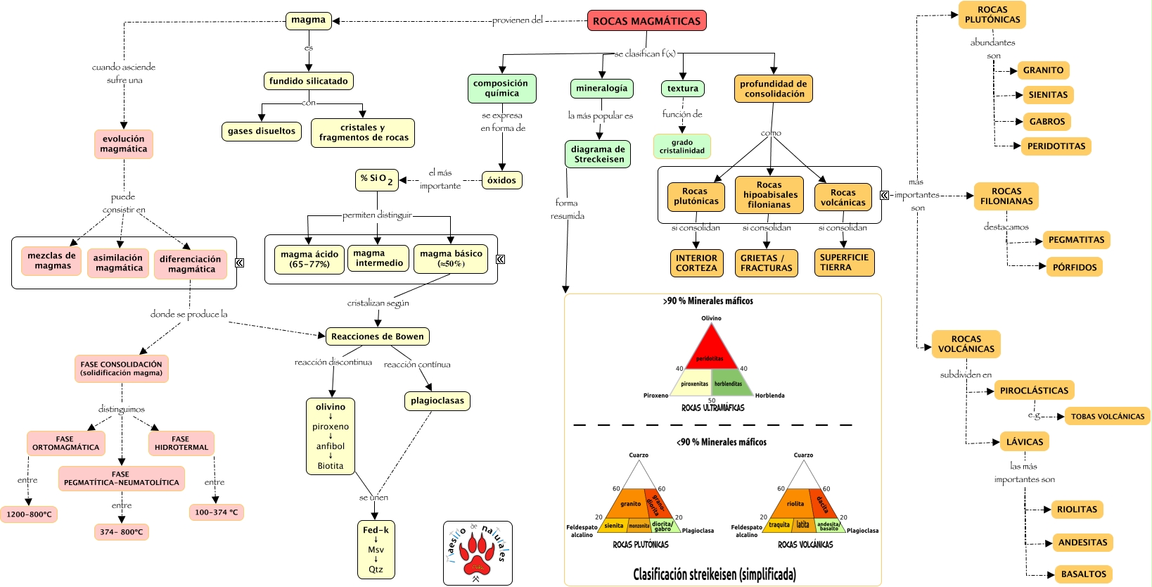 Este Cmap, tiene información relacionada con: Tema 04, ROCAS PLUTÓNICAS abundantes son SIENITAS, olivino ↓ piroxeno ↓ anfibol ↓ Biotita se unen Fed-k ↓ Msv ↓ Qtz, ROCAS MAGMÁTICAS se clasifican f(x) composición química, Rocas volcánicas si consolidan SUPERFICIE TIERRA, magma básico (≈50%) cristalizan según Reacciones de Bowen, óxidos el más importante <math xmlns="http://www.w3.org/1998/Math/MathML"> <mrow> <mtext> % Si </mtext> <mmultiscripts> <mtext> O </mtext> <mtext> 2 </mtext> <none/> </mmultiscripts> </mrow> </math>, ROCAS MAGMÁTICAS se clasifican f(x) mineralogía, <math xmlns="http://www.w3.org/1998/Math/MathML"> <mrow> <mtext> % Si </mtext> <mmultiscripts> <mtext> O </mtext> <mtext> 2 </mtext> <none/> </mmultiscripts> </mrow> </math> permiten distinguir magma intermedio, FASE ORTOMAGMÁTICA entre 1200-800ºC, profundidad de consolidación como Rocas plutónicas, LÁVICAS las más importantes son BASALTOS, evolución magmática puede consistir en diferenciación magmática, ROCAS MAGMÁTICAS se clasifican f(x) profundidad de consolidación, ROCAS VOLCÁNICAS subdividen en PIROCLÁSTICAS, ROCAS FILONIANAS destacamos PÓRFIDOS, diagrama de Streckeisen forma resumida, evolución magmática puede consistir en mezclas de magmas, <math xmlns="http://www.w3.org/1998/Math/MathML"> <mrow> <mtext> % Si </mtext> <mmultiscripts> <mtext> O </mtext> <mtext> 2 </mtext> <none/> </mmultiscripts> </mrow> </math> permiten distinguir magma básico (≈50%), FASE HIDROTERMAL entre 100-374 ºC, plagioclasas se unen Fed-k ↓ Msv ↓ Qtz
